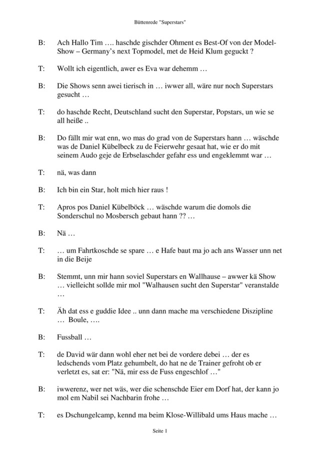 de kadolisch Kersch, wär dann bestimmt ach mit von de Partie T: Boule-Superstar gäb wohl de WieNa – obwohl, beim Sportfeschd diesjohr hat er jo nimme genau gewuscht, dass es Spiel erschd bei 13 Punkte aus ess unn net schon bei 12 …. awwer gudd – der spellt jo es ganze Johr net … B: Vor 14 Dach off de Jahreshauptversammlung hat de Jugendclub ach sei Superstars prämiert …. Sieger es ganz knapp vorm Selle Matz und em Erich, de Stäwels Andy mit 1500 Bier, seit Bestehen wor … T: ma muss allerdings debei sahn, dass de Matz faschd e ganzes Johr net do war … hmm das alles net schlecht ... awwer wäschde, was ma off jede Fall mache müssd … e Gesangswettbewerb … iwwer leh mol, wer do alles mitmache kennd: de Jugendchor, aäh es Vokalensemble, E605, … Lustlos nadierlich, de Waldi-Natur-Chor … onn die Menge Anna … B: de Männergesangsverein, von Freidachs nom Training, kennd awwer ach metmache … T: messe se awwer offpasse, dass ihr zwei gröschde Fans, de Helmut unn de Fettes Klaus net nochmol vom de Zuscherränge entfernt genn … B: wo ma grad beim Sport senn, an irgend so ner Uni hann se e 3 jährige Studie gemacht, um raussefinne, ob Sport schlau macht … T: die hädde sich nur mo e Interview mem Boris Becker angugge solle, dann hädde se sich die 3 Johr ach spare kenne B: Jo, Die Babs hat sich domols off jedie Arschbacke e "B" tätiwiere geloss … für Boris Becker … ähnes Dachs ware se em Bad, unn wie die Babs sich no de Seife gebückt hat, hat se de Boris ganz perplex gefroht: "Äh Babs, äh wer ess äh Bob?" Um mo nochmol off die Superstars zereck se komme … wäschde watt, mir mischde do doch wohl dann ach met mache, …. ich menn wäärrr kann dann do im Dorf schon singe, wenn net mir? T: Stimmt … ich iwe jo jedes Johr an Weihnachde en de Kersch un außerdem hodd ich 9 Johr Musik en de Schul …