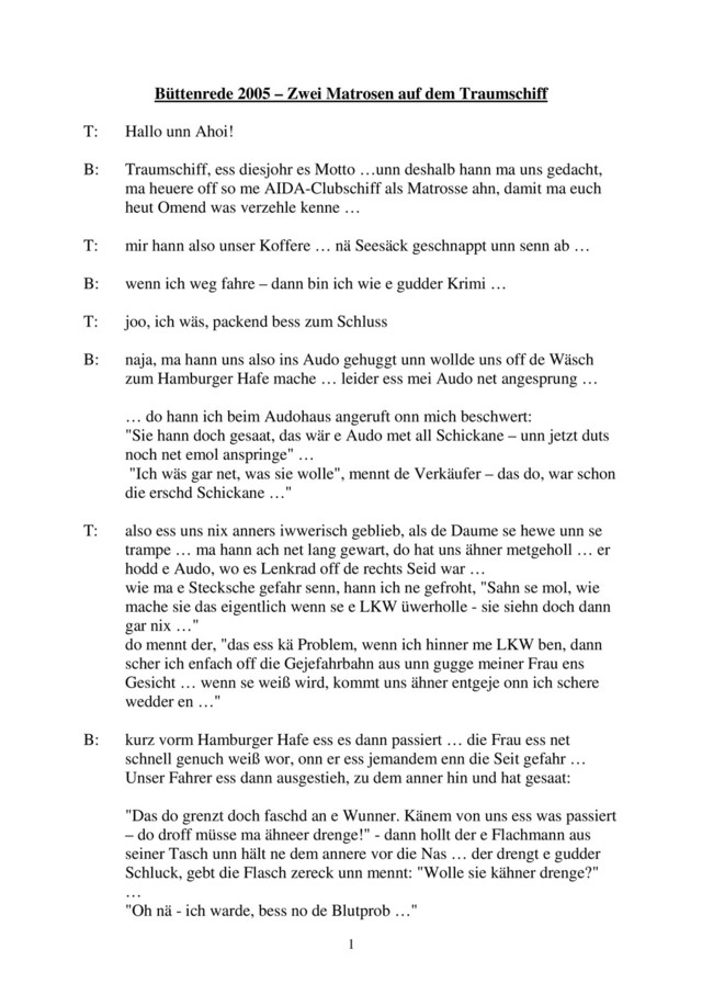 Hallo unn Ahoi! B: Traumschiff, ess diesjohr es Motto …unn deshalb hann ma uns gedacht, ma heuere off so me AIDA-Clubschiff als Matrosse ahn, damit ma euch heut Omend was verzehle kenne … T: mir hann also unser Koffere … nä Seesäck geschnappt unn senn ab … B: wenn ich weg fahre – dann bin ich wie e gudder Krimi … T: joo, ich wäs, packend bess zum Schluss B: naja, ma hann uns also ins Audo gehuggt unn wollde uns off de Wäsch zum Hamburger Hafe mache … leider ess mei Audo net angesprung … … do hann ich beim Audohaus angeruft onn mich beschwert: "Sie hann doch gesaat, das wär e Audo met all Schickane – unn jetzt duts noch net emol anspringe" … "Ich wäs gar net, was sie wolle", mennt de Verkäufer – das do, war schon die erschd Schickane …" T: also ess uns nix anners iwwerisch geblieb, als de Daume se hewe unn se trampe … ma hann ach net lang gewart, do hat uns ähner metgeholl … er hodd e Audo, wo es Lenkrad off de rechts Seid war … wie ma e Stecksche gefahr senn, hann ich ne gefroht, "Sahn se mol, wie mache sie das eigentlich wenn se e LKW üwerholle - sie siehn doch dann gar nix …" do mennt der, "das ess kä Problem, wenn ich hinner me LKW ben, dann scher ich enfach off die Gejefahrbahn aus unn gugge meiner Frau ens Gesicht … wenn se weiß wird, kommt uns ähner entgeje onn ich schere wedder en …" B: kurz vorm Hamburger Hafe ess es dann passiert … die Frau ess net schnell genuch weiß wor, onn er ess jemandem enn die Seit gefahr … Unser Fahrer ess dann ausgestieh, zu dem anner hin und hat gesaat: "Das do grenzt doch faschd an e Wunner. Känem von uns ess was passiert – do droff müsse ma ähneer drenge!" - dann hollt der e Flachmann aus seiner Tasch unn hält ne dem annere vor die Nas … der drengt e gudder Schluck, gebt die Flasch zereck unn mennt: "Wolle sie kähner drenge?" … "Oh nä - ich warde, bess no de Blutprob …"