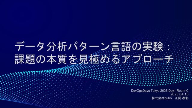 ・準備・インフラ整備に関わるパターン :3つ ・データ分析そのものに関するパターン :7つ ・データを活用した改善活動に関するパターン:5つ パターンの紹介 ・SQiP2024で小室氏(共著:鷲崎氏)によって発表された ・ソフトウェアプロセス改善を組織的、実証的にすすめるためのもの ・課題発見や解決に役立つ知見や方法論を体系的にまとめたもの 参考文献:ソフトウェアプロセス改善を組織的、実証的にすすめるためのデータ分析パターン言語の提案 (https://www.juse.jp/sqip/symposium/2024/timetable/files/A2-2_ronbun.pdf)