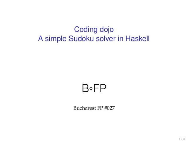 approach is inefficient, but correct Equational reasoning to improve performance Define a function prune that eliminates early invalid solutions filter valid . expand = filter valid . expand . prune It is not hard to define a function to prune a row (exercise): pruneRow [[4],[1,2],[1],[1,3]] = [[4],[2],[1],[3]] Equational reasoning to define prune in terms of pruneRow The function pruneRow satisfies the equation filter nodups . cp = filter nodups . cp . pruneRow Expand the expression filter valid . expand Use the above equation and compress back the formula 19 / 21