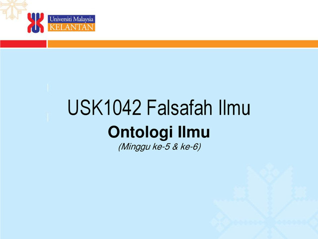 : a) Ruang Lingkup Ilmu b) Klasifikasi Ilmu c) Hukum Ilmu • Ontologi ilmu adalah perbincangan tentang hakikat atau kewujudan ilmu. Bagaimana kewujudan ilmu diketahui, sempadan ruangnya, pembahagiannya dan pola-pola hukumnya.