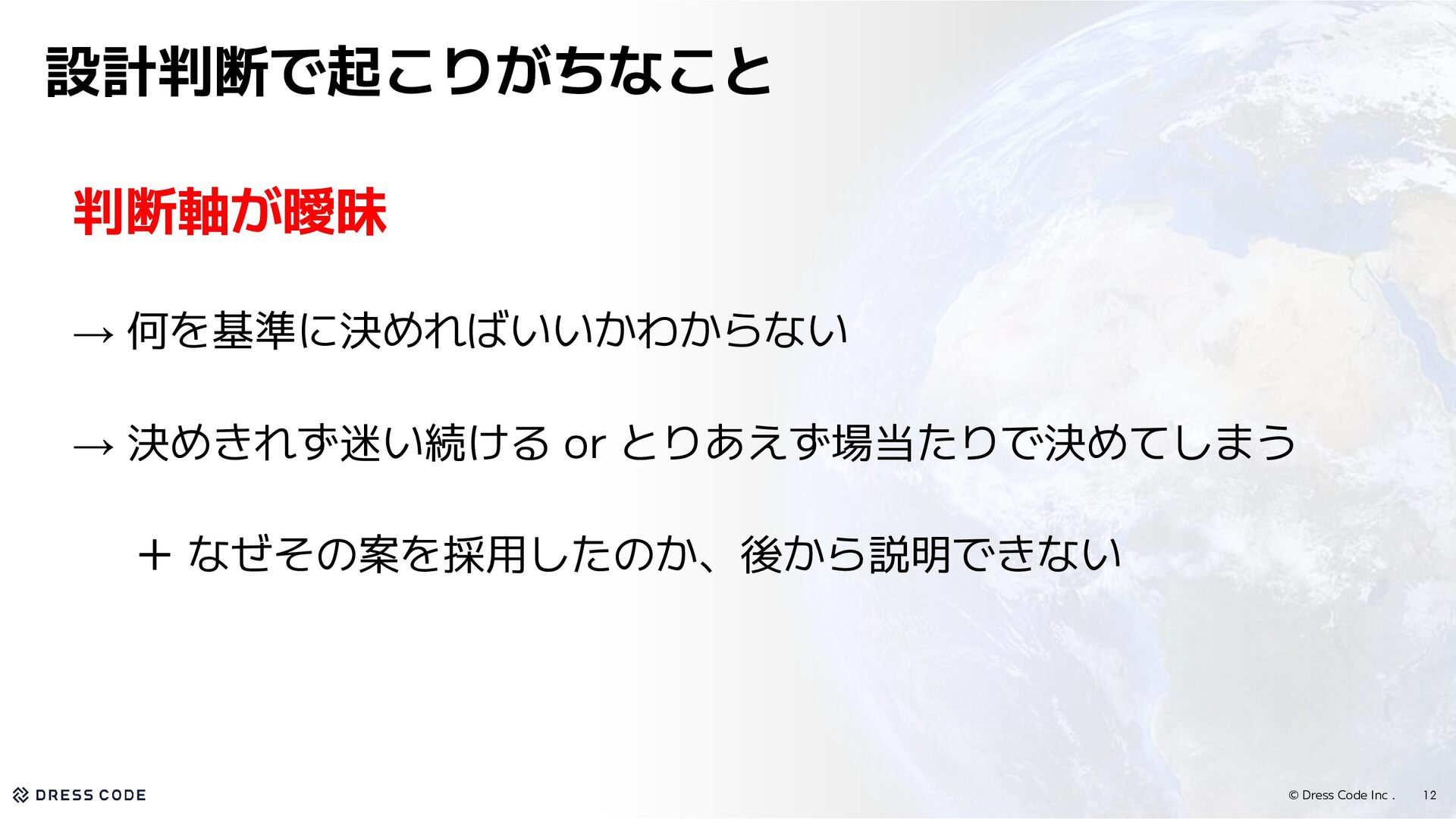 6. © Dress Code Inc . 12 設計判断で起こりがちなこと 判断軸が曖昧 → 何を基準に決めればいいかわからない