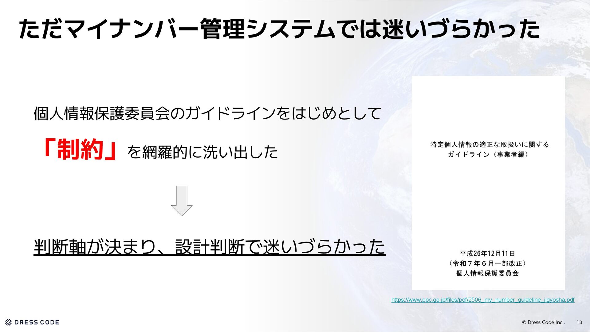 12. © Dress Code Inc . 除外として効く制約 比較として効く制約 法令・規制 ・個人情報取扱事業者は、次に掲げる場合 を除くほか、あらかじめ本人の同意を得な