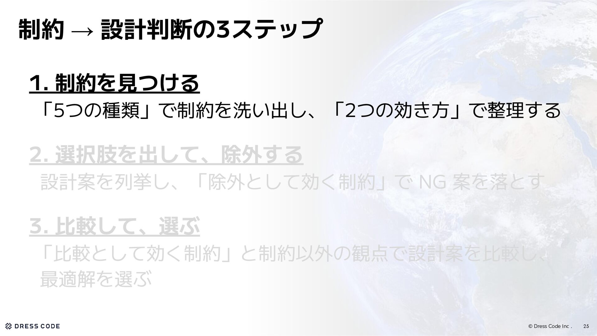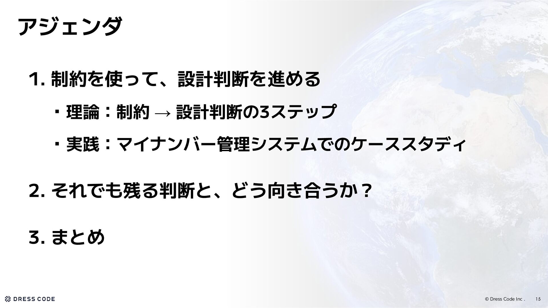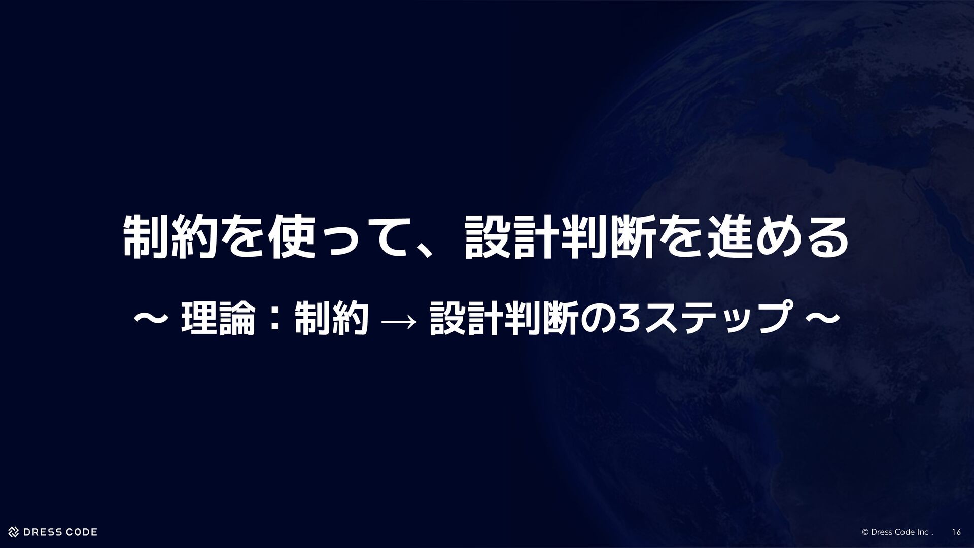 7. © Dress Code Inc . 15 1. 制約を使って、設計判断を進める ・理論:制約 →
