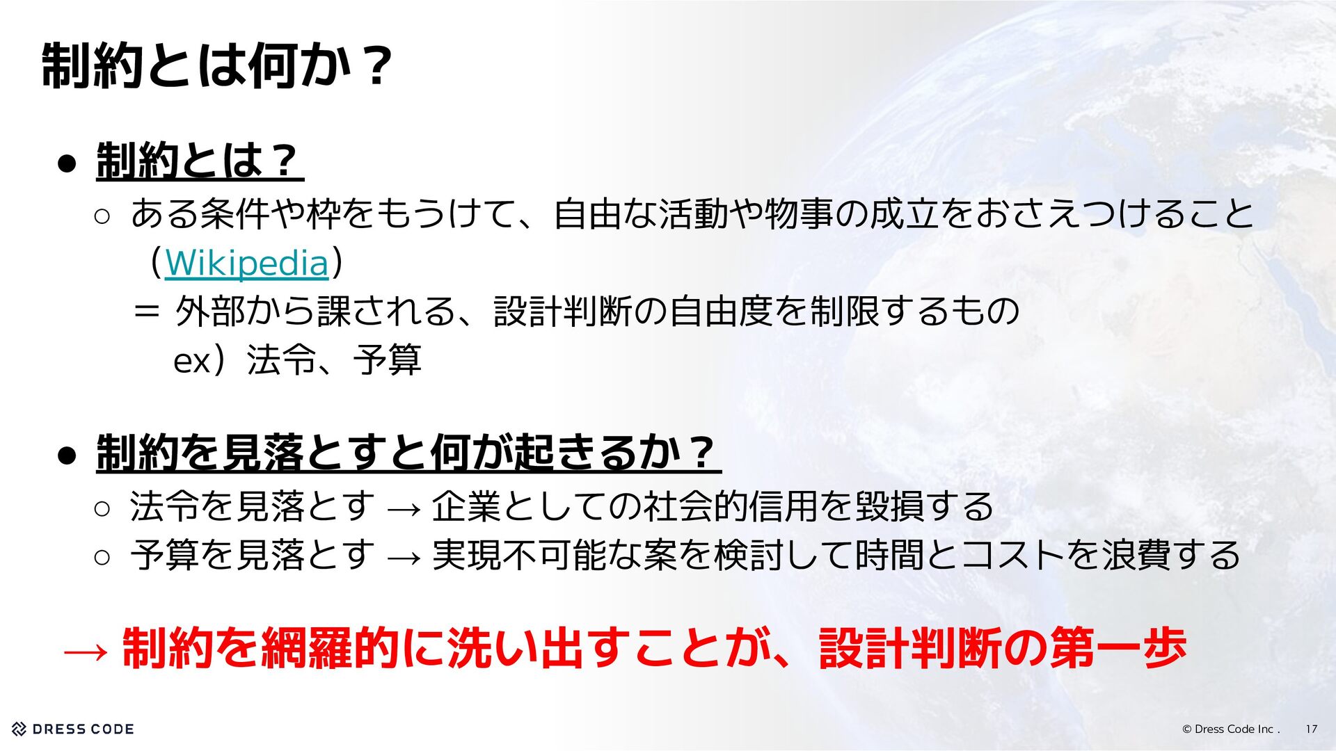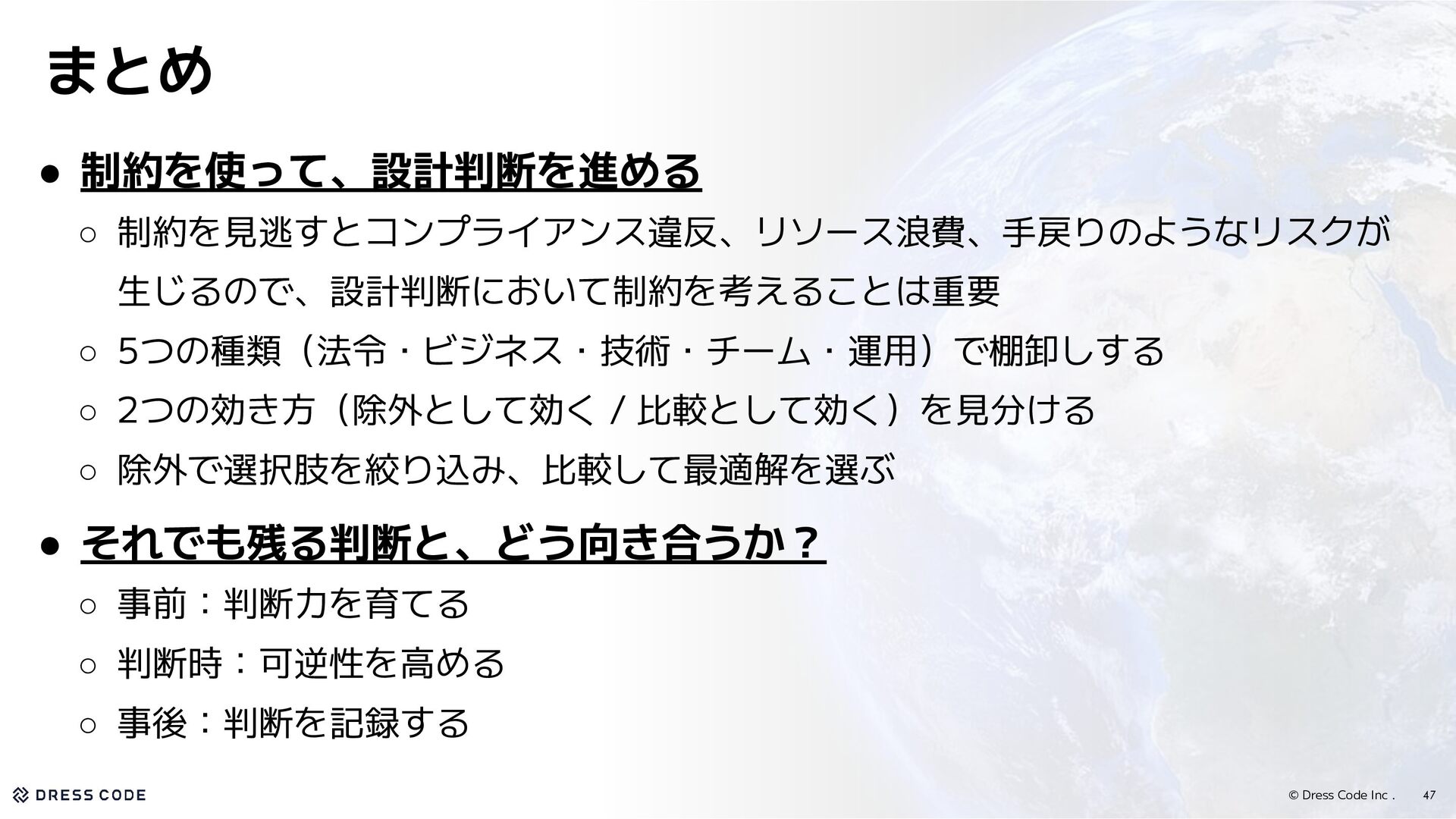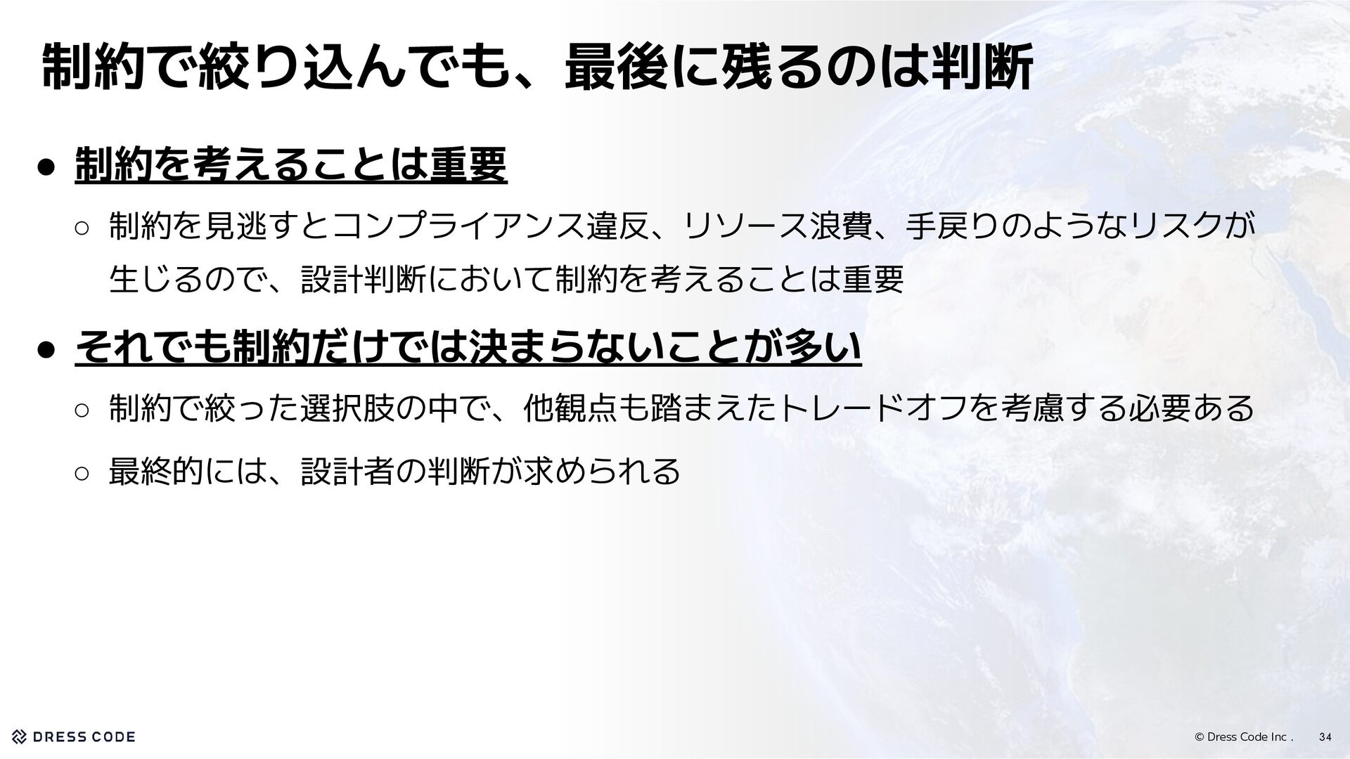 33. © Dress Code Inc . • 制約を使って、設計判断を進める ◦ 制約を見逃すとコンプライアンス違反、リソース浪費、手戻りのようなリスクが 生じるので、設計判断において制約を考えることは重要