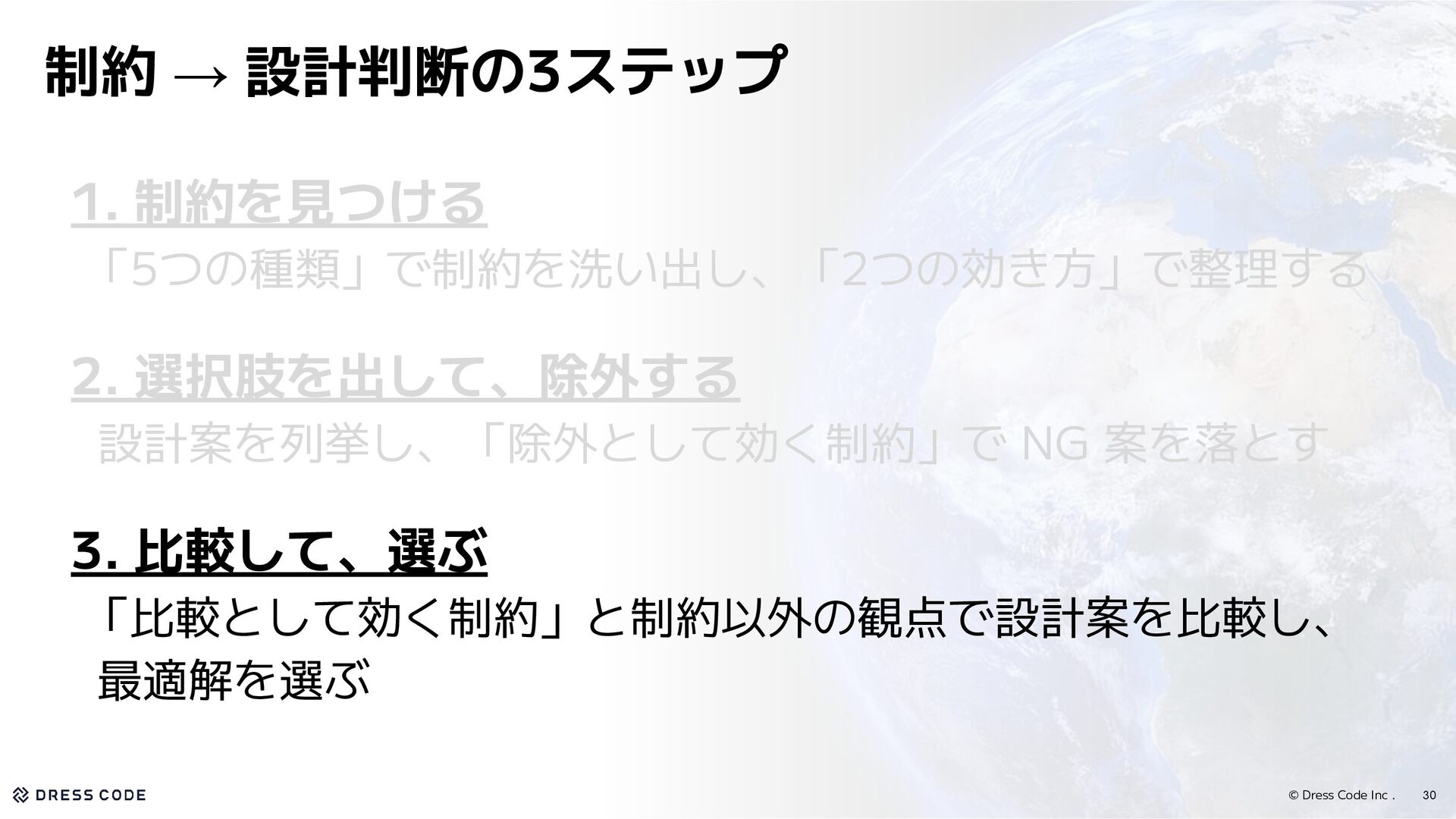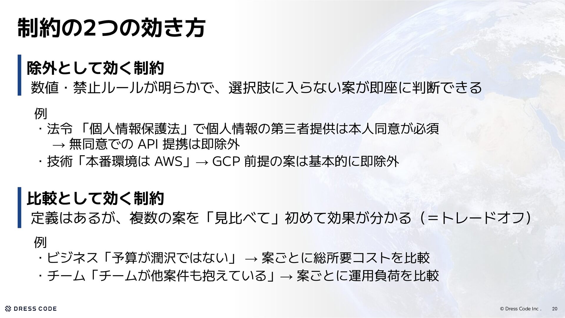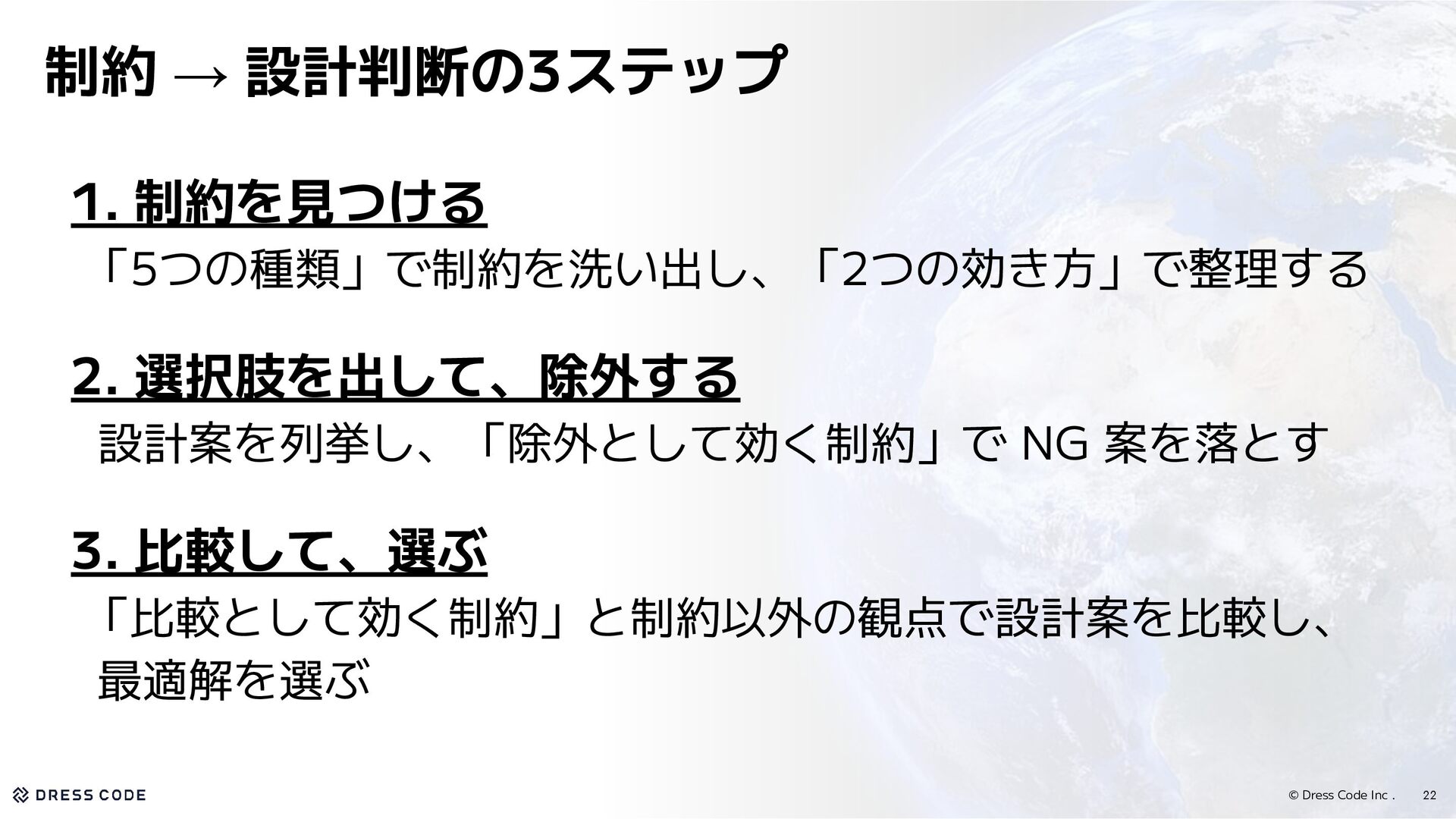 33. © Dress Code Inc . • 制約を使って、設計判断を進める ◦ 制約を見逃すとコンプライアンス違反、リソース浪費、手戻りのようなリスクが 生じるので、設計判断において制約を考えることは重要