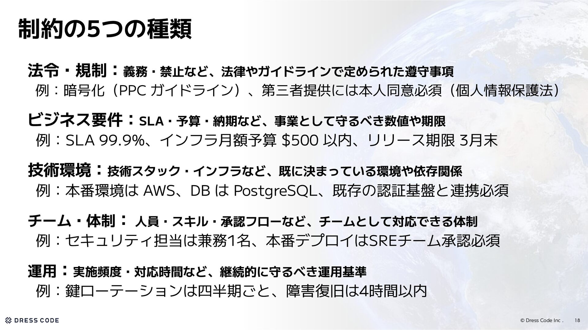 9. © Dress Code Inc . 法令・規制:義務・禁止など、法律やガイドラインで定められた遵守事項 例:暗号化(PPC ガイドライン)、第三者提供には本人同意必須(個人情報保護法) ビジネス要件:SLA・予算・納期など、事業として守るべき数値や期限 例:SLA