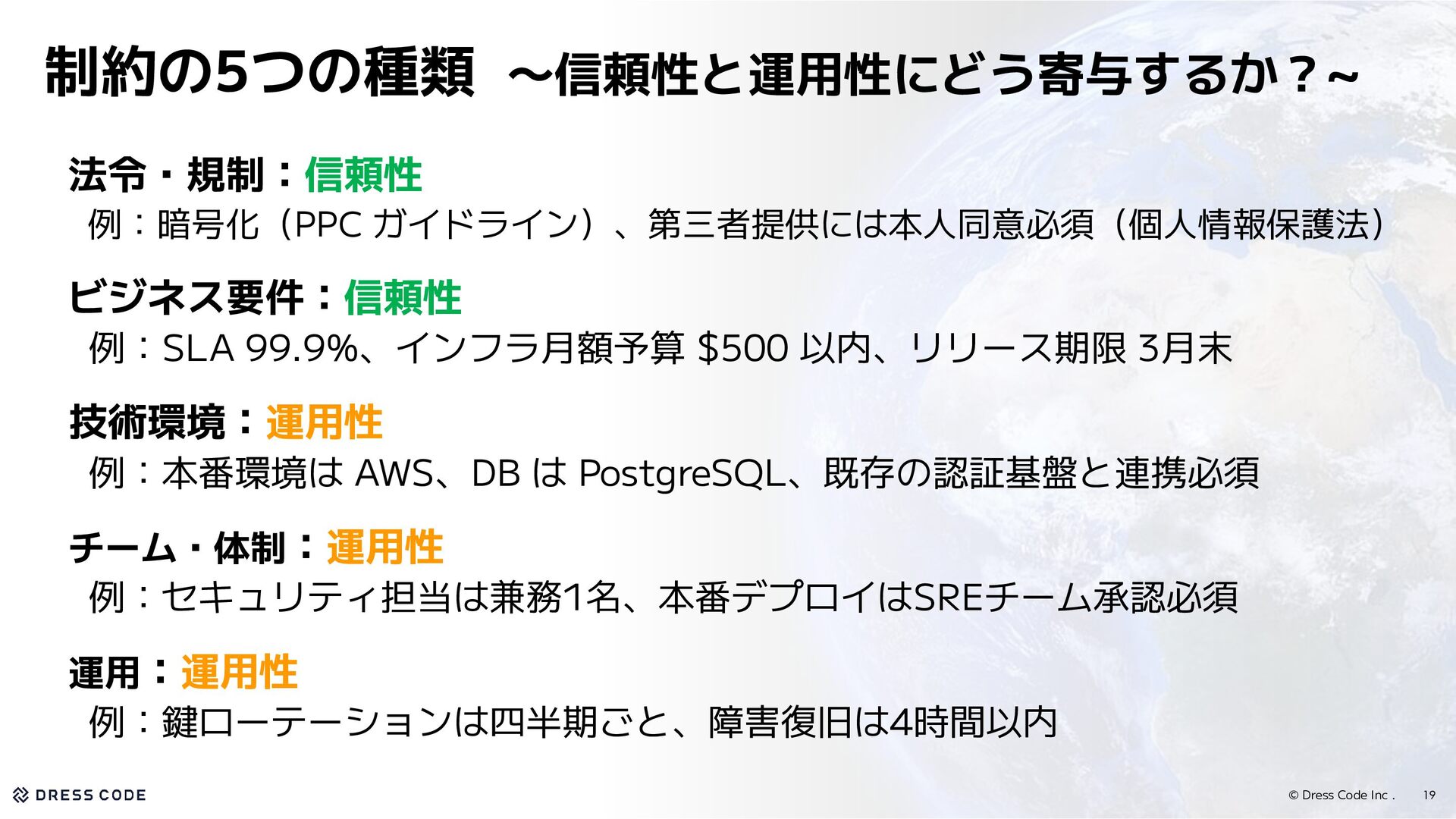 99.9%、インフラ月額予算 $500 以内、リリース期限 3月末 技術環境:技術スタック・インフラなど、既に決まっている環境や依存関係 例:本番環境は AWS、DB は PostgreSQL、既存の認証基盤と連携必須 チーム・体制: 人員・スキル・承認フローなど、チームとして対応できる体制 例:セキュリティ担当は兼務1名、本番デプロイはSREチーム承認必須 運用:実施頻度・対応時間など、継続的に守るべき運用基準 例:鍵ローテーションは四半期ごと、障害復旧は4時間以内 18 制約の5つの種類
