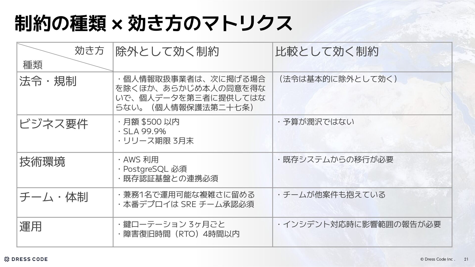 いで、個人データを第三者に提供してはな らない。(個人情報保護法第二十七条) (法令は基本的に除外として効く) ビジネス要件 ・月額 $500 以内 ・SLA 99.9% ・リリース期限 3月末 ・予算が潤沢ではない 技術環境 ・AWS 利用 ・PostgreSQL 必須 ・既存認証基盤との連携必須 ・既存システムからの移行が必要 チーム・体制 ・兼務1名で運用可能な複雑さに留める ・本番デプロイは SRE チーム承認必須 ・チームが他案件も抱えている 運用 ・鍵ローテーション 3ヶ月ごと ・障害復旧時間(RTO)4時間以内 ・インシデント対応時に影響範囲の報告が必要 21 制約の種類 × 効き方のマトリクス 種類 効き方