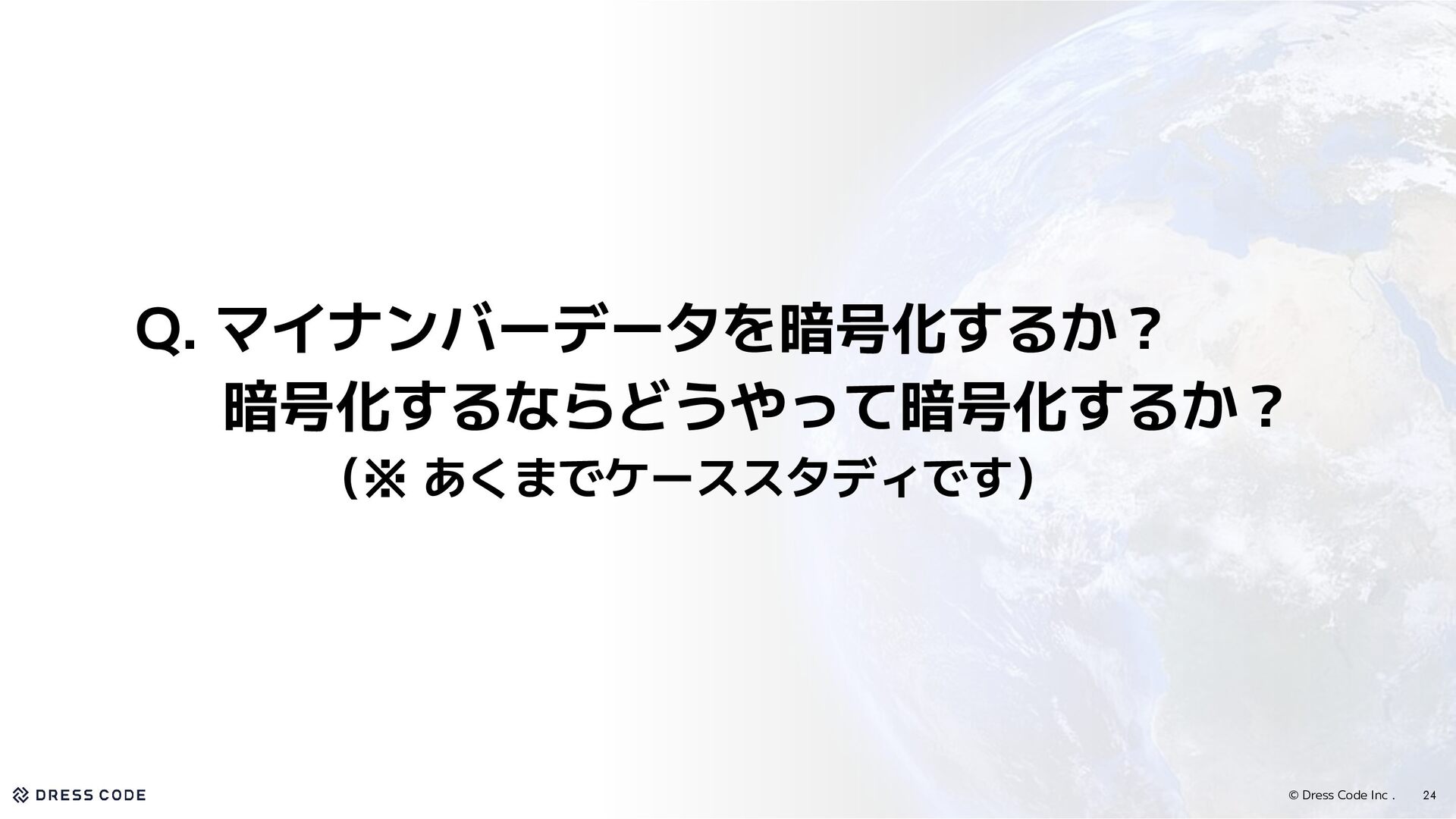 法令・規制 ・暗号化は実質必須  ・番号法「適切な管理措置」  ・個人情報保護委員会のガイドライン 「暗号化又はパスワードによる保護を推奨」 (法令は基本的に除外として効く) ビジネス要件 - ・予算が潤沢ではない 技術環境 ・AWS 利用 - チーム・体制 ・兼務1名で運用可能な複雑さに留める - 運用 - ・インシデント対応時に影響範囲の報告が必要 種類 効き方