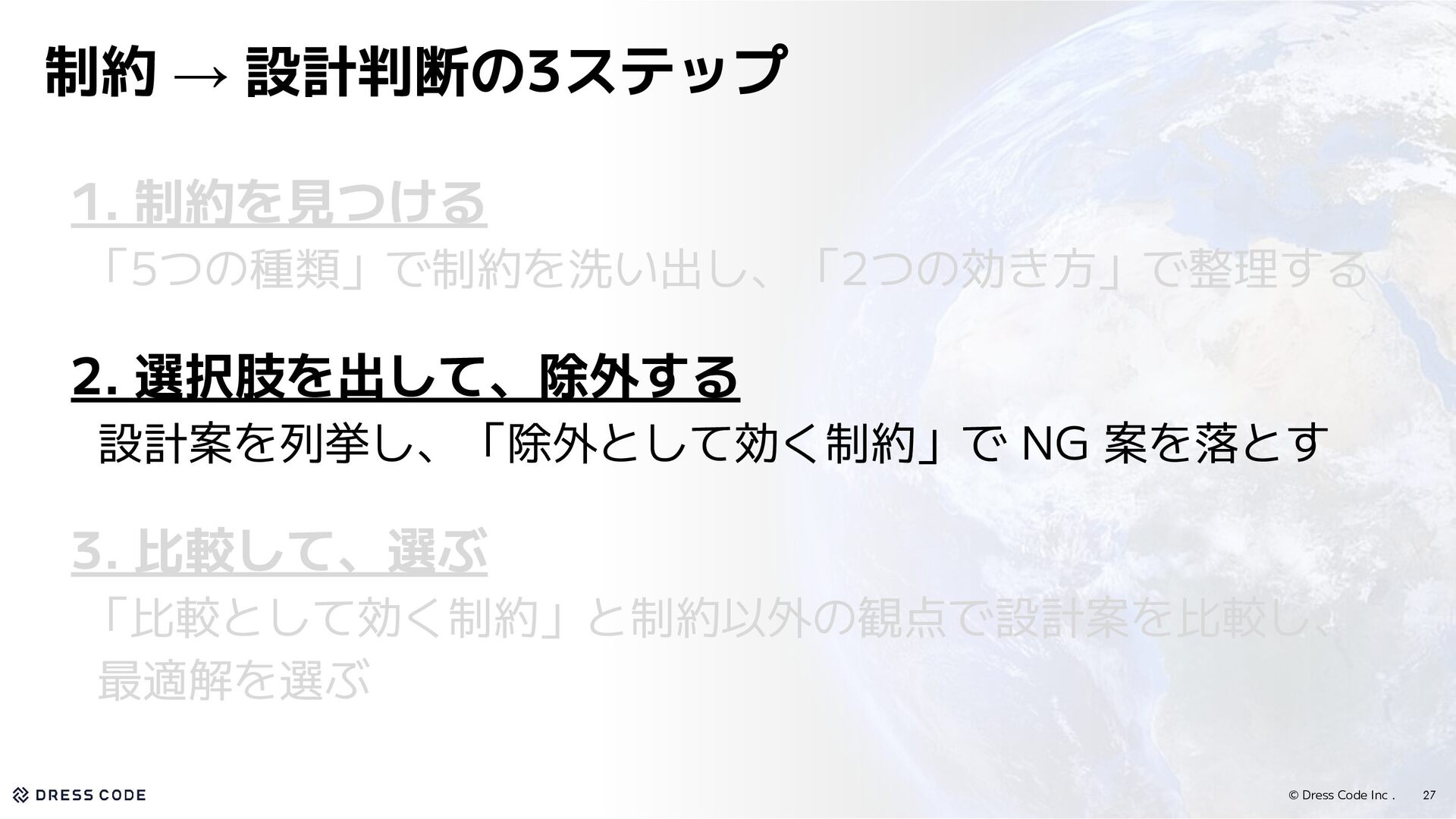 16. © Dress Code Inc . 1. 制約を見つける 「5つの種類」で制約を洗い出し、「2つの効き方」で整理する 2. 選択肢を出して、除外する