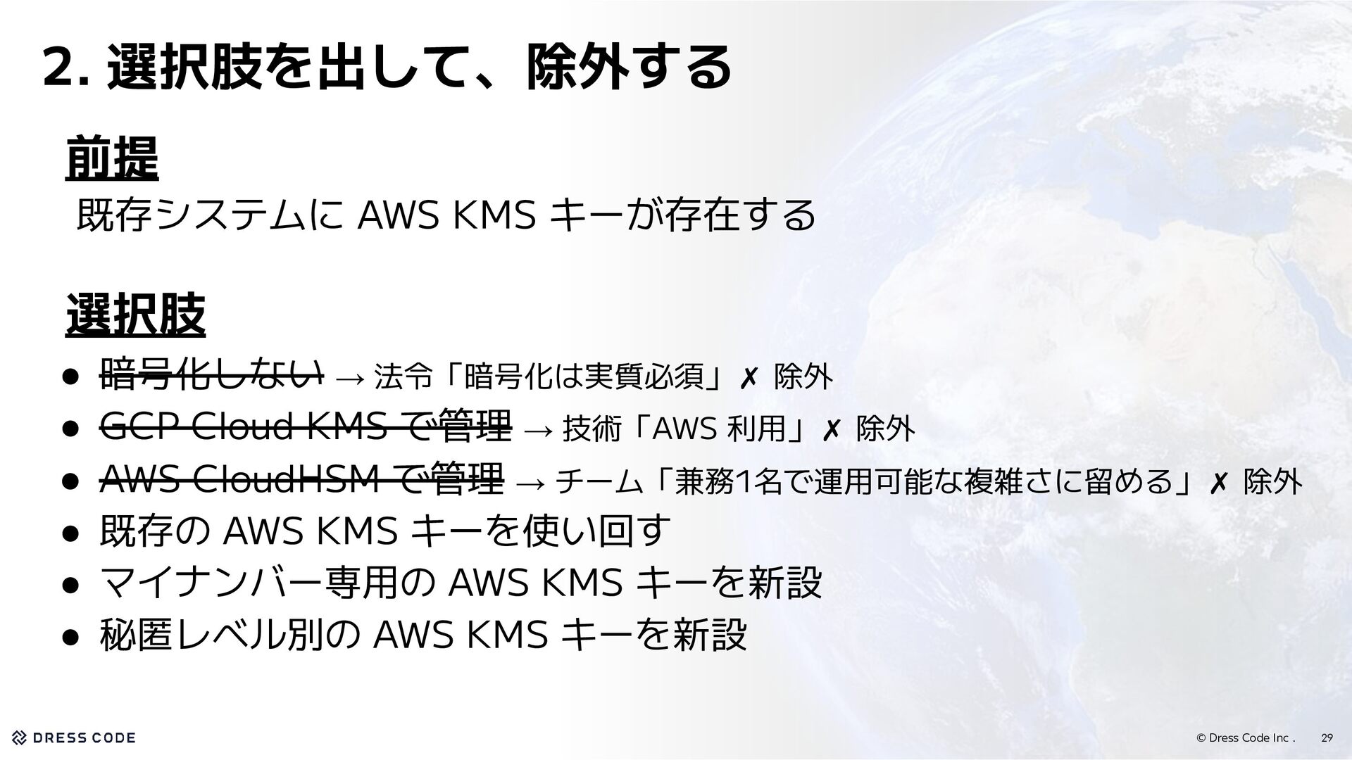 キーが存在する 選択肢 • 暗号化しない → 法令「暗号化は実質必須」✗ 除外 • GCP Cloud KMS で管理 → 技術「AWS 利用」✗ 除外 • AWS CloudHSM で管理 → チーム「兼務1名で運用可能な複雑さに留める」✗ 除外 • 既存の AWS KMS キーを使い回す • マイナンバー専用の AWS KMS キーを新設 • 秘匿レベル別の AWS KMS キーを新設 2. 選択肢を出して、除外する
