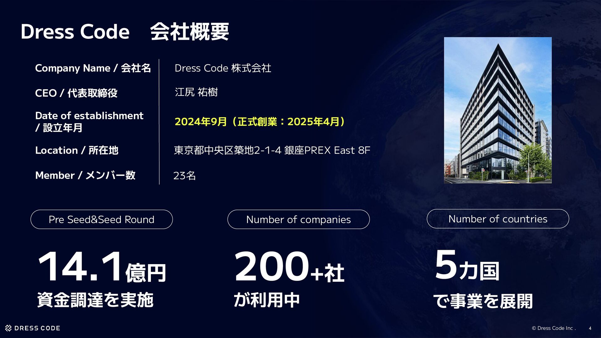 200+社 が利用中  Number of companies Number of countries 5カ国 で事業を展開  Dress Code 会社概要 Company Name / 会社名 Dress Code 株式会社 2024年9月(正式創業:2025年4月) 23名 東京都中央区築地2-1-4 銀座PREX East 8F CEO / 代表取締役 Date of establishment / 設立年月 Location / 所在地 江尻 祐樹 Member / メンバー数 4