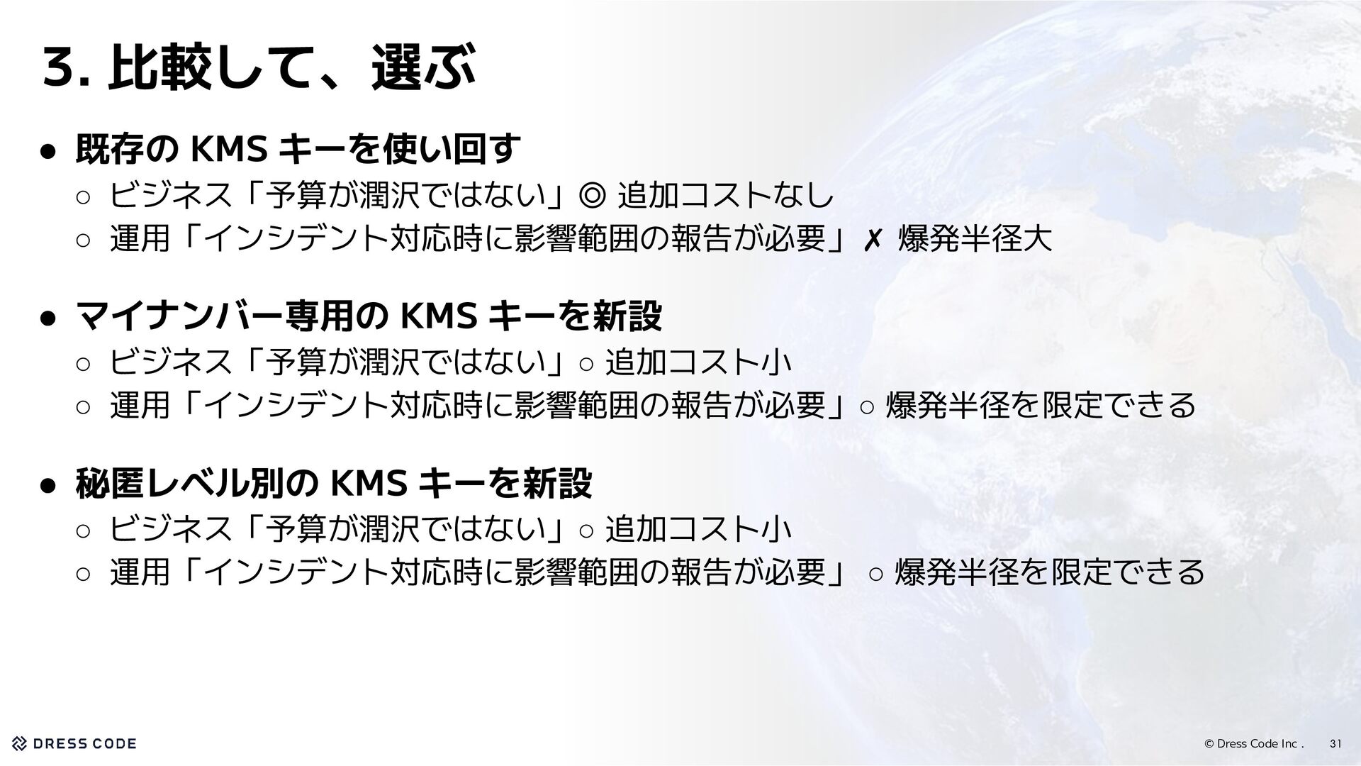 KMS キーを使い回す ◦ ビジネス「予算が潤沢ではない」◎ 追加コストなし ◦ 運用「インシデント対応時に影響範囲の報告が必要」✗ 爆発半径大 ◦ 制約以外の観点「後から拡張できるか?」✗ 混在状態から分離するのが大変 • マイナンバー専用の KMS キーを新設 ◦ ビジネス「予算が潤沢ではない」◦ 追加コスト小 ◦ 運用「インシデント対応時に影響範囲の報告が必要」◦ 爆発半径を限定できる ◦ 制約以外の観点「後から拡張できるか?」◦ 必要になったら秘匿別に移行可能 • 秘匿レベル別の KMS キーを新設 ◦ ビジネス「予算が潤沢ではない」◦ 追加コスト小 ◦ 運用「インシデント対応時に影響範囲の報告が必要」 ◦ 爆発半径を限定できる ◦ 制約以外の観点「後から拡張できるか?」△ 最初から完成形