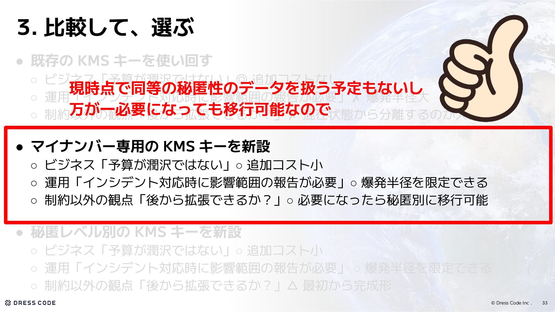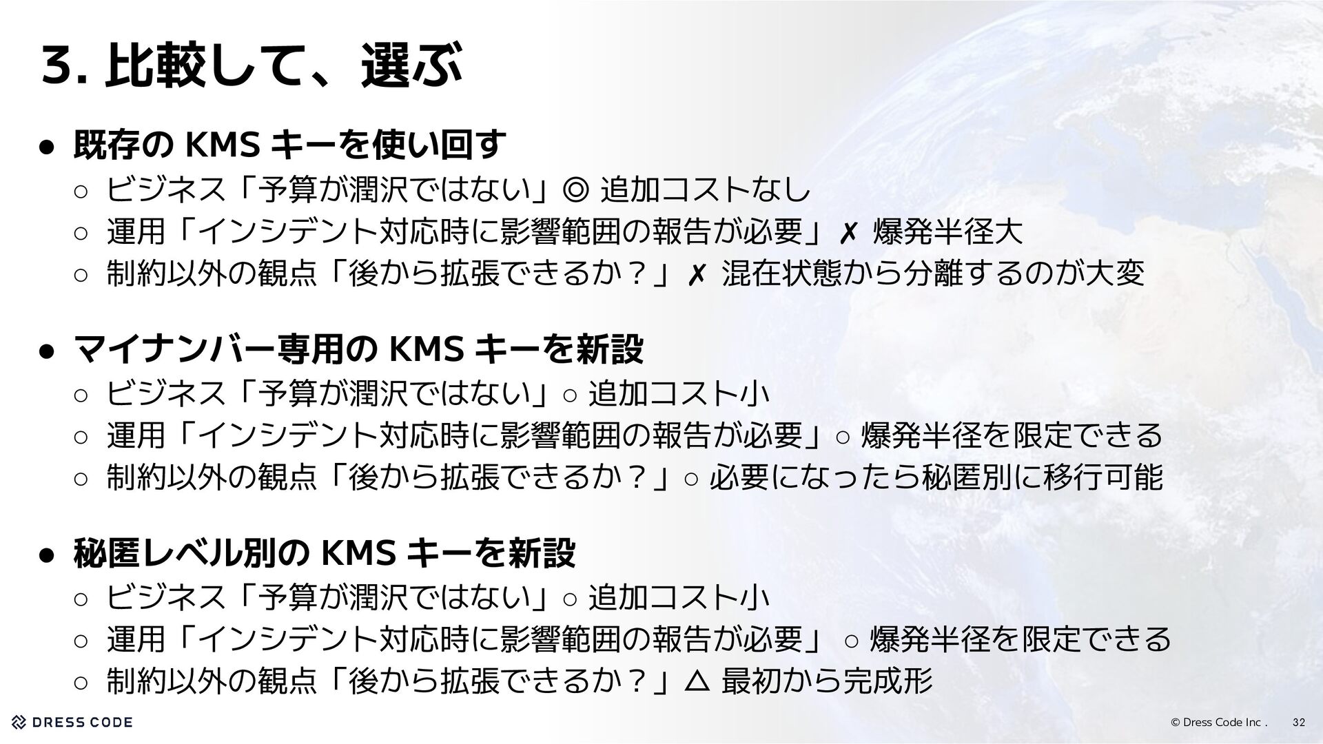 KMS キーを使い回す ◦ ビジネス「予算が潤沢ではない」◎ 追加コストなし ◦ 運用「インシデント対応時に影響範囲の報告が必要」✗ 爆発半径大 ◦ 制約以外の観点「後から拡張できるか?」✗ 混在状態から分離するのが大変 • マイナンバー専用の KMS キーを新設 ◦ ビジネス「予算が潤沢ではない」◦ 追加コスト小 ◦ 運用「インシデント対応時に影響範囲の報告が必要」◦ 爆発半径を限定できる ◦ 制約以外の観点「後から拡張できるか?」◦ 必要になったら秘匿別に移行可能 • 秘匿レベル別の KMS キーを新設 ◦ ビジネス「予算が潤沢ではない」◦ 追加コスト小 ◦ 運用「インシデント対応時に影響範囲の報告が必要」 ◦ 爆発半径を限定できる ◦ 制約以外の観点「後から拡張できるか?」△ 最初から完成形 現時点で同等の秘匿性のデータを扱う予定もないし 万が一必要になっても移行可能なので