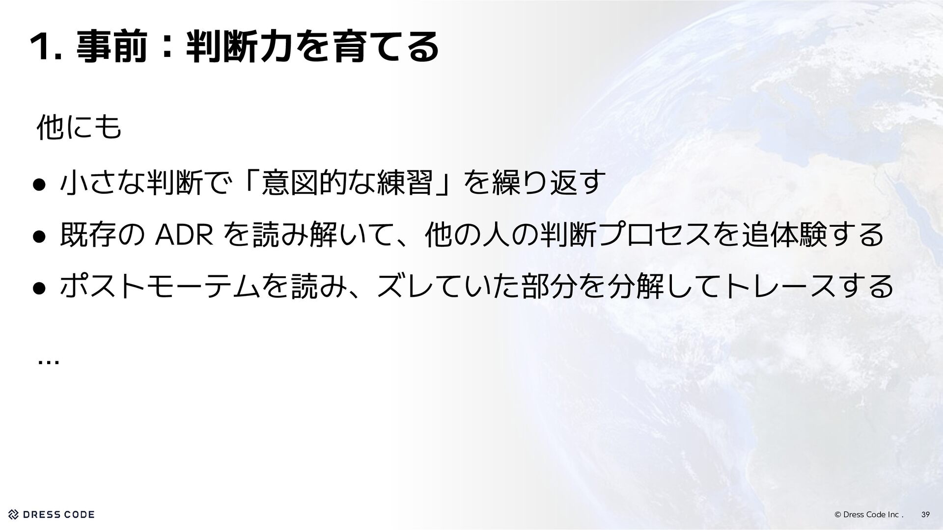 小さな判断で「意図的な練習」を繰り返す • 既存の ADR を読み解いて、他の人の判断プロセスを追体験する • ポストモーテムを読み、ズレていた部分を分解してトレースする …