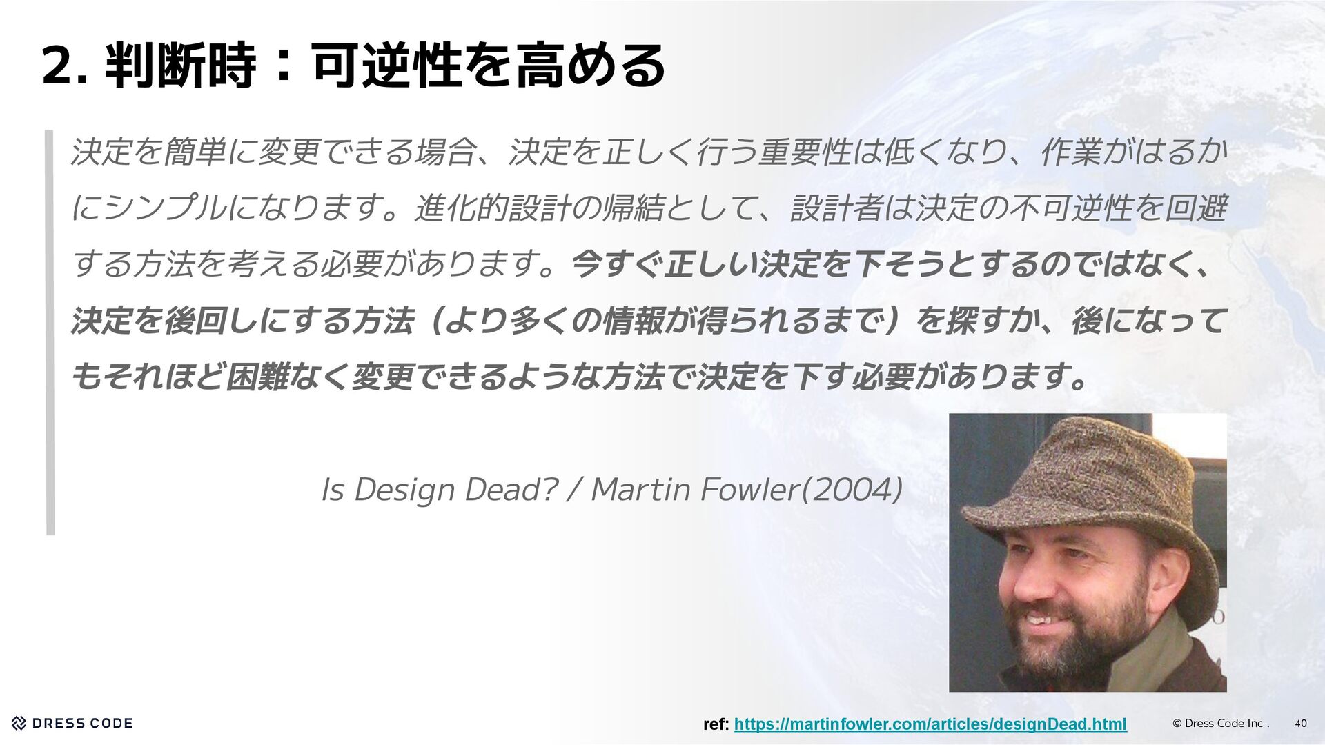 27. © Dress Code Inc . 40 2. 判断時:可逆性を高める 決定を簡単に変更できる場合、決定を正しく行う重要性は低くなり、作業がはるか にシンプルになります。進化的設計の帰結として、設計者は決定の不可逆性を回避
