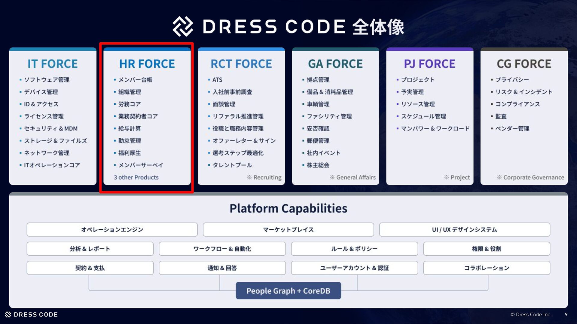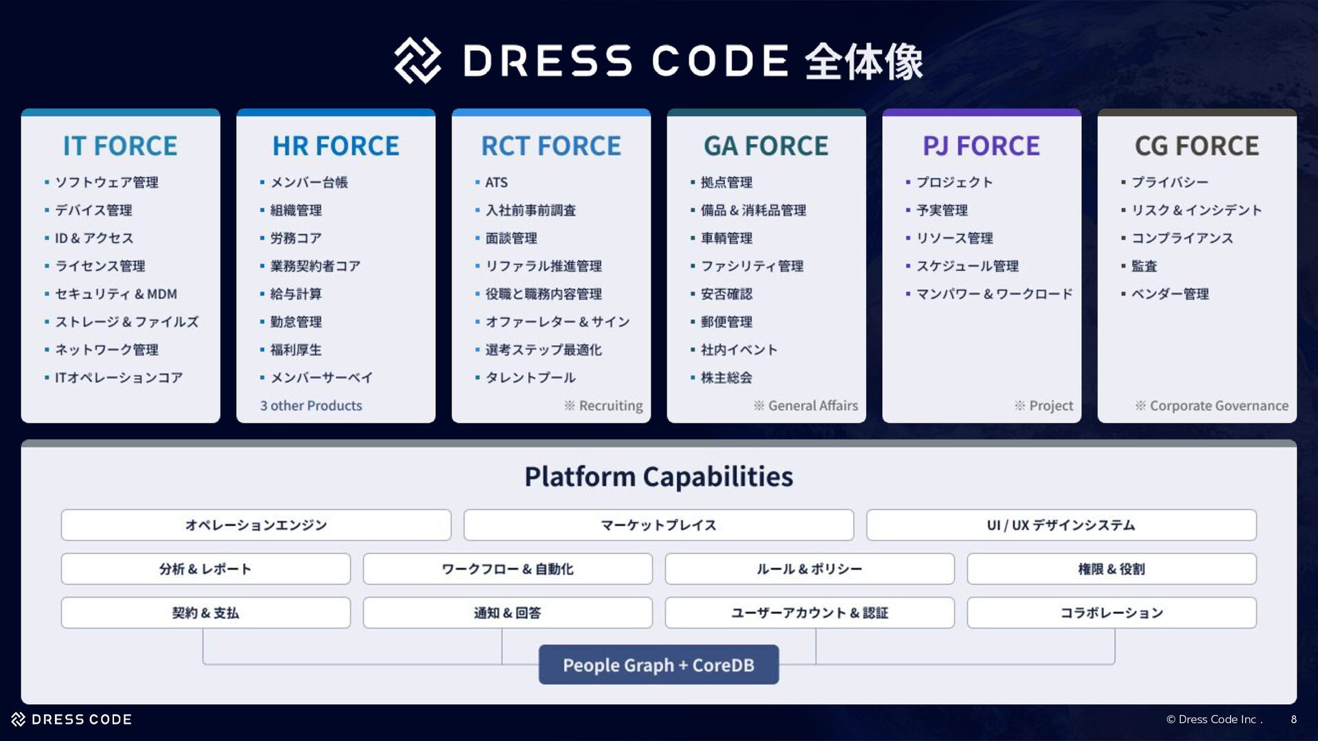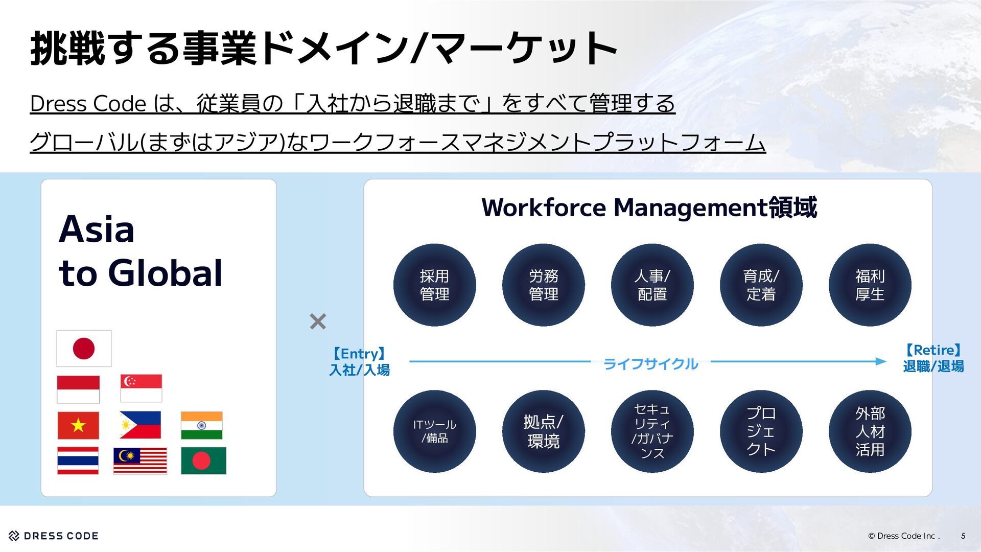 3. © Dress Code Inc . 挑戦する事業ドメイン/マーケット Dress Code は、従業員の「入社から退職まで」をすべて管理する グローバル(まずはアジア)なワークフォースマネジメントプラットフォーム