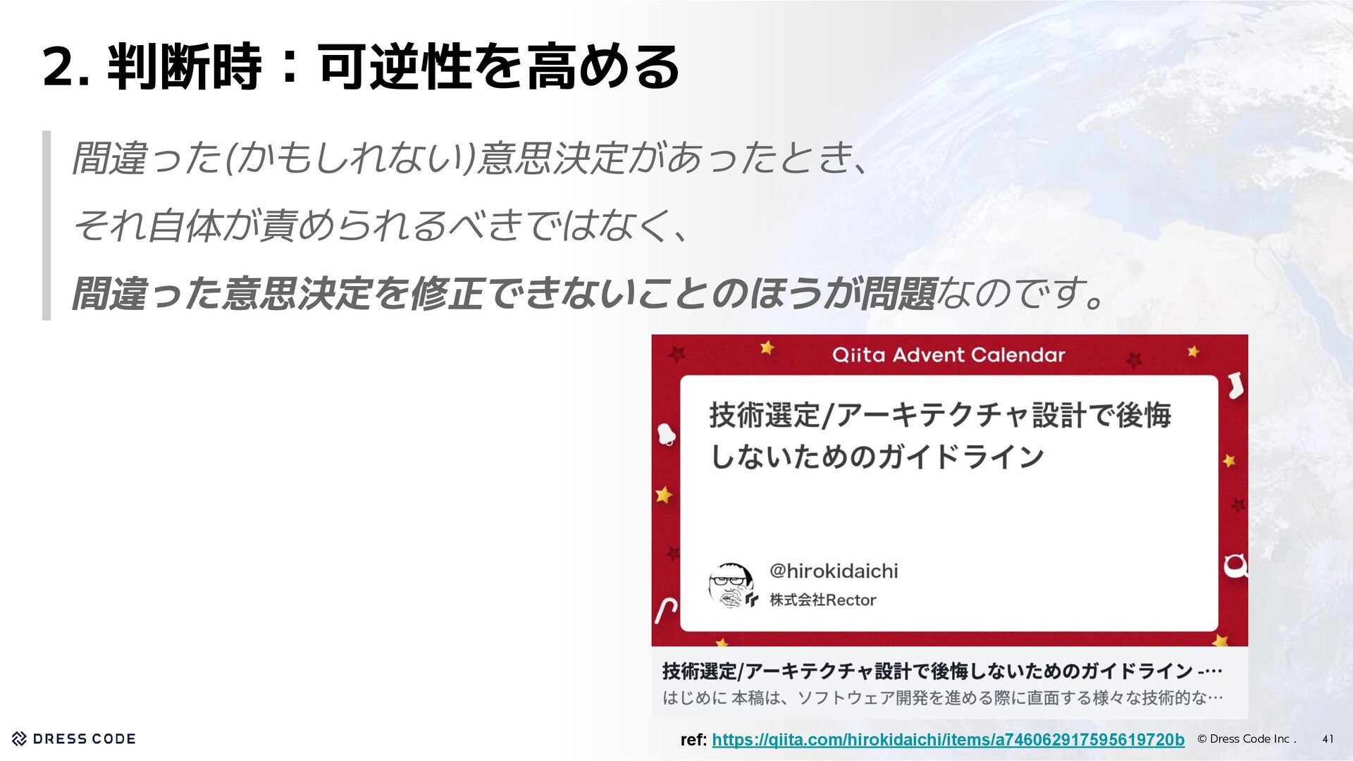 28. © Dress Code Inc . 41 2. 判断時:可逆性を高める 間違った(かもしれない)意思決定があったとき、 それ自体が責められるべきではなく、