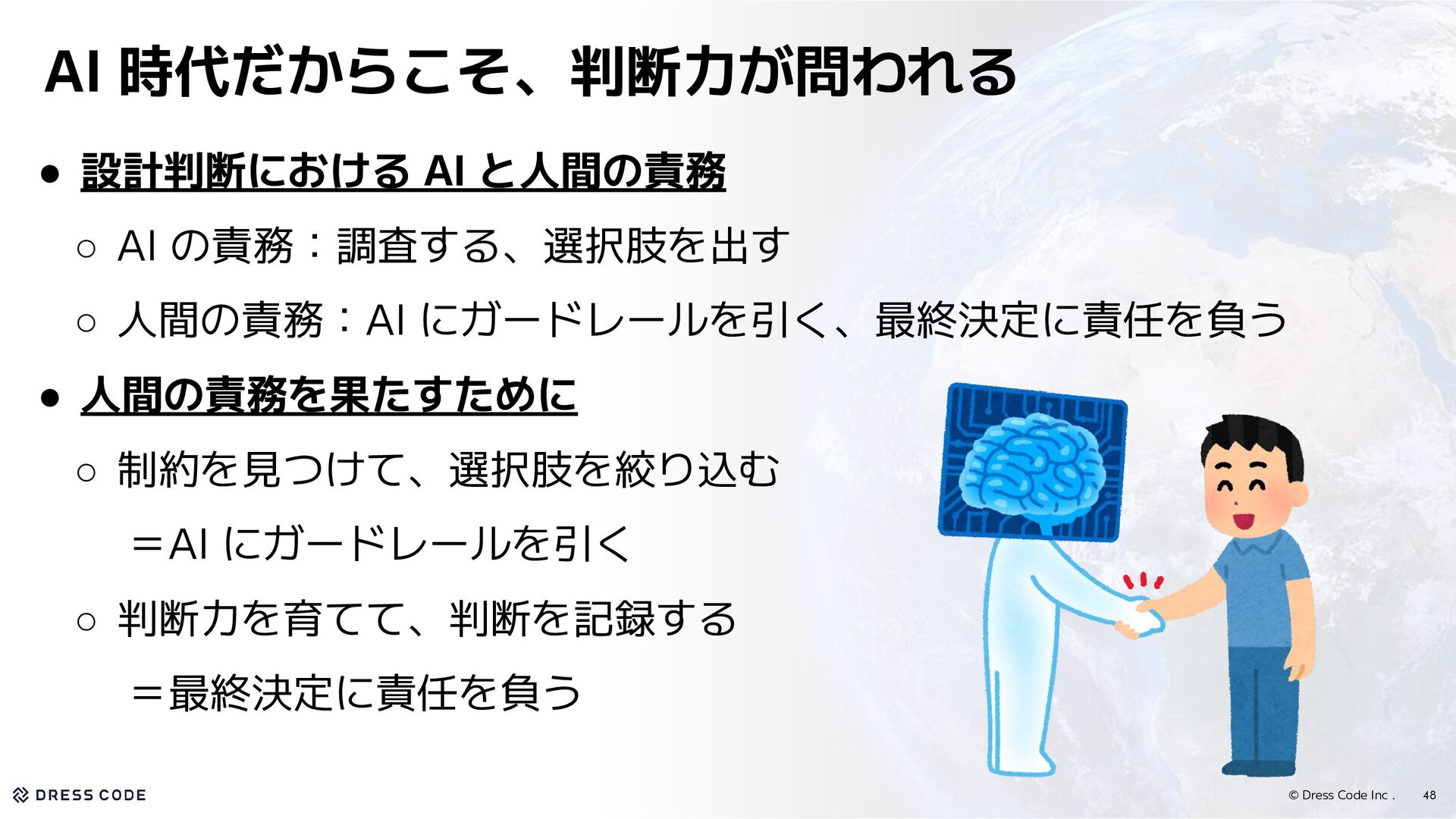 34. © Dress Code Inc . 48 AI 時代だからこそ、判断力が問われる • 設計判断における