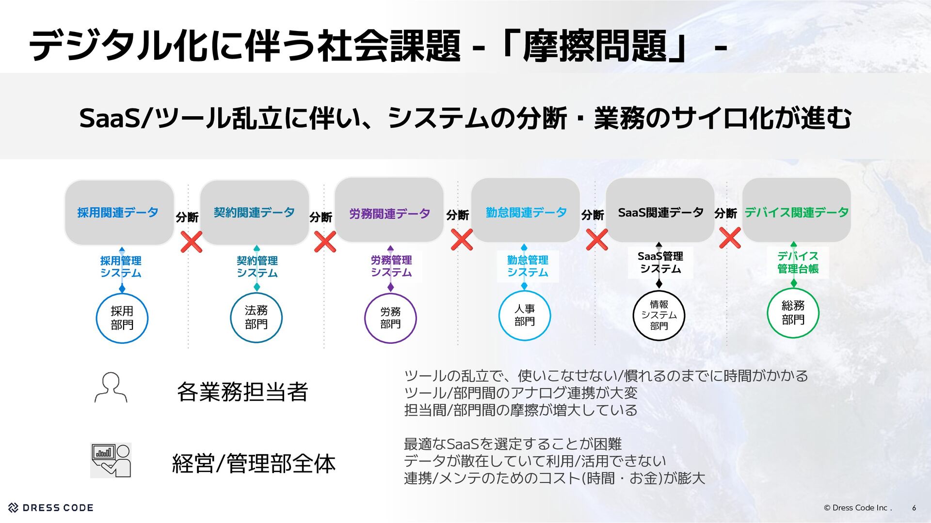 4. © Dress Code Inc . デジタル化に伴う社会課題 -「摩擦問題」 - SaaS/ツール乱立に伴い、システムの分断・業務のサイロ化が進む 採用