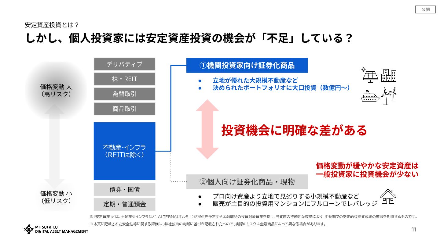 公開 しかし、個⼈投資家には安定資産投資の機会が「不⾜」している? 安定資産投資とは? 価格変動 ⼤ (⾼リスク) 価格変動 ⼩ (低リスク) 株‧REIT