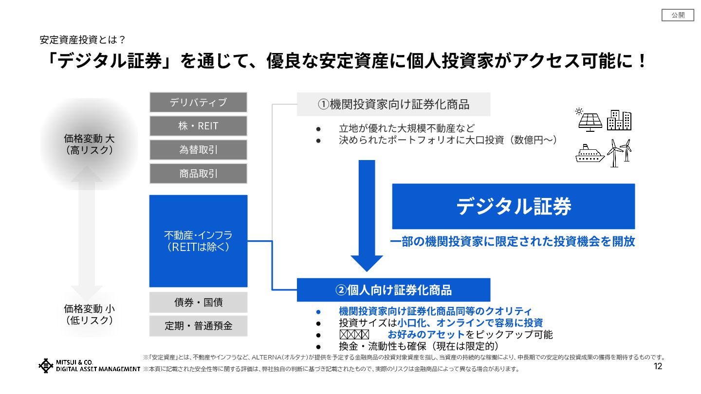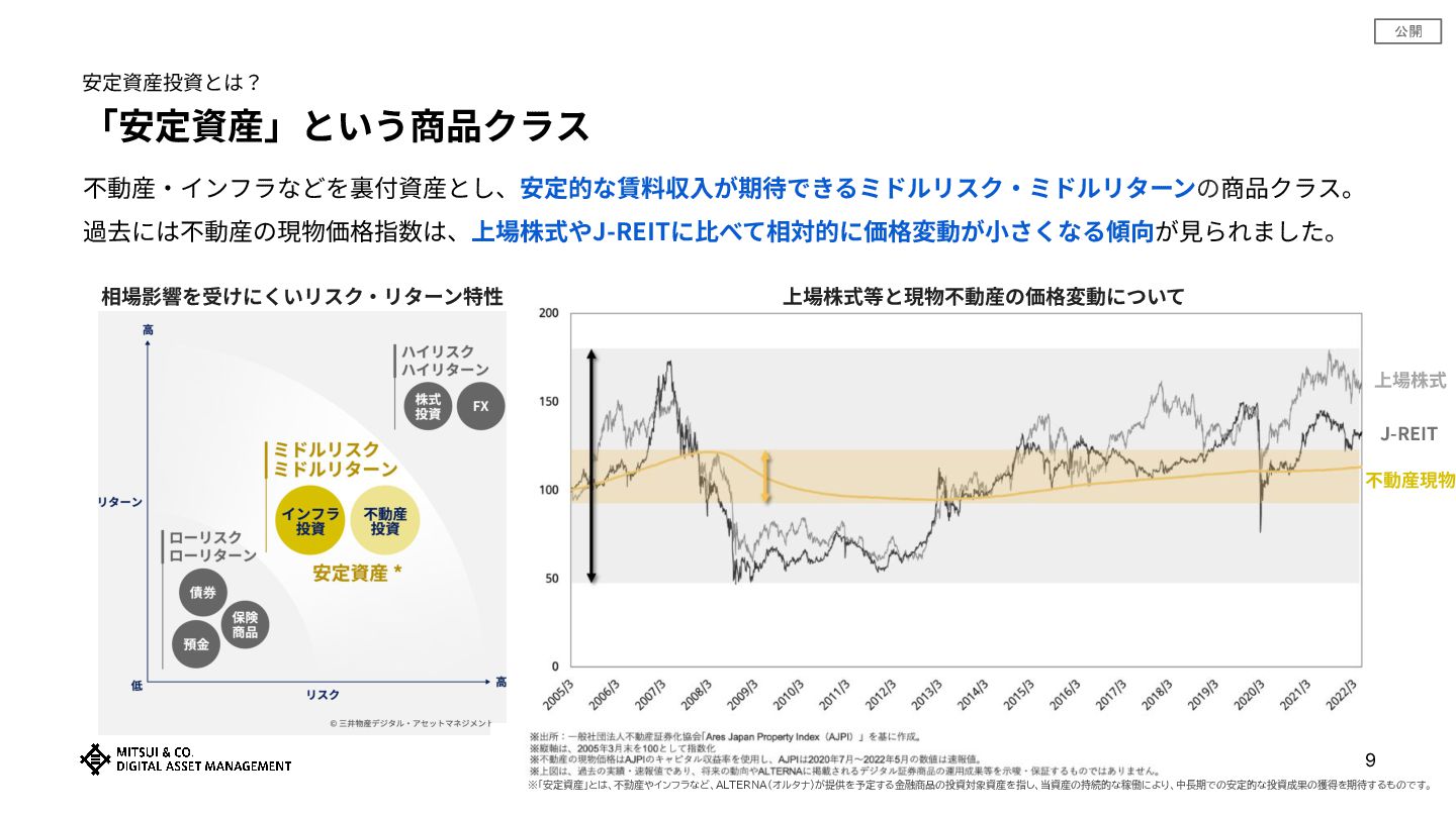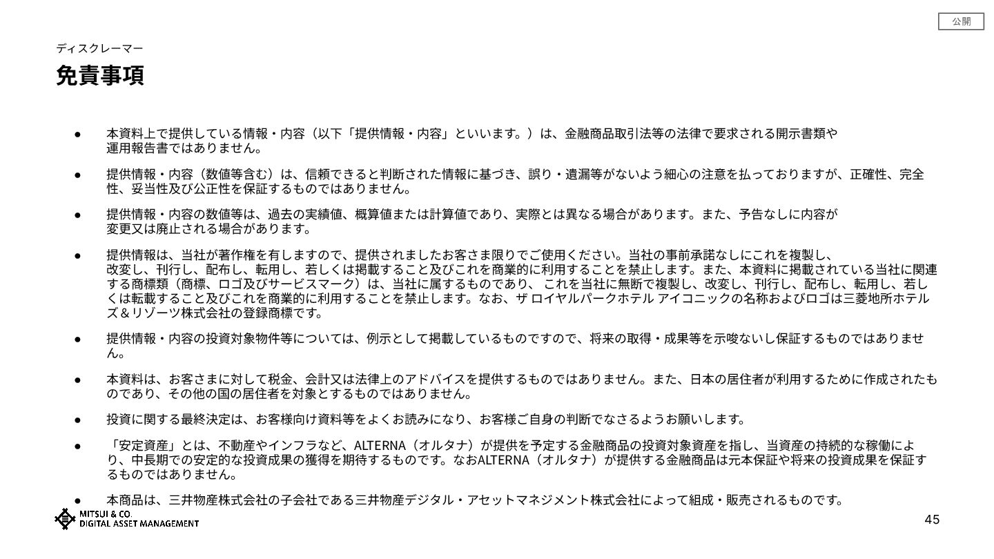 • 提供情報‧内容の数値等は、過去の実績値、概算値または計算値であり、実際とは異なる場合があります。また、予告なしに内容が 変更⼜は廃⽌される場合があります。 • 提供情報は、当社が著作権を有しますので、提供されましたお客さま限りでご使⽤ください。当社の事前承諾なしにこれを複製し、 改変し、刊⾏し、配布し、転⽤し、若しくは掲載すること及びこれを商業的に利⽤することを禁⽌します。また、本資料に掲載されている当社に関連 する商標類(商標、ロゴ及びサービスマーク)は、当社に属するものであり、 これを当社に無断で複製し、改変し、刊⾏し、配布し、転⽤し、若し くは転載すること及びこれを商業的に利⽤することを禁⽌します。なお、ザ ロイヤルパークホテル アイコニックの名称およびロゴは三菱地所ホテル ズ&リゾーツ株式会社の登録商標です。 • 提供情報‧内容の投資対象物件等については、例⽰として掲載しているものですので、将来の取得‧成果等を⽰唆ないし保証するものではありませ ん。 • 本資料は、お客さまに対して税⾦、会計⼜は法律上のアドバイスを提供するものではありません。また、⽇本の居住者が利⽤するために作成されたも のであり、その他の国の居住者を対象とするものではありません。 • 投資に関する最終決定は、お客様向け資料等をよくお読みになり、お客様ご⾃⾝の判断でなさるようお願いします。 • 「安定資産」とは、不動産やインフラなど、ALTERNA(オルタナ)が提供を予定する⾦融商品の投資対象資産を指し、当資産の持続的な稼働によ り、中⻑期での安定的な投資成果の獲得を期待するものです。なおALTERNA(オルタナ)が提供する⾦融商品は元本保証や将来の投資成果を保証す るものではありません。 • 本商品は、三井物産株式会社の⼦会社である三井物産デジタル‧アセットマネジメント株式会社によって組成‧販売されるものです。