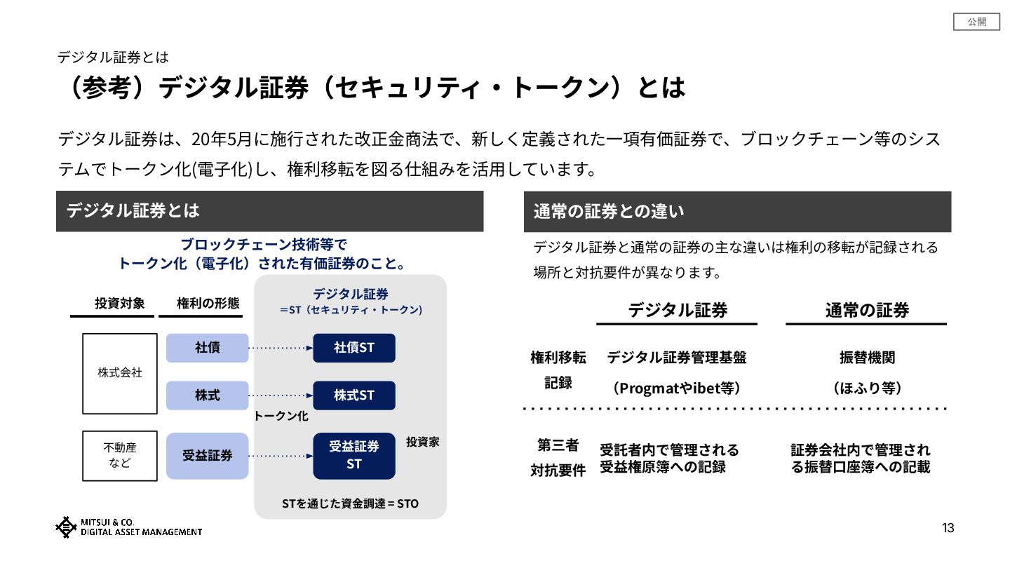 公開 13 (参考)デジタル証券(セキュリティ‧トークン)とは デジタル証券は、20年5⽉に施⾏された改正⾦商法で、新しく定義された⼀項有価証券で、ブロックチェーン等のシス テムでトークン化(電⼦化)し、権利移転を図る仕組みを活⽤しています。 ブロックチェーン技術等で トークン化(電⼦化)された有価証券のこと。 デジタル証券とは 通常の証券との違い 投資家