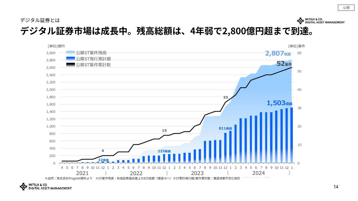 公開 デジタル証券市場は成⻑中。残⾼総額は、4年弱で2,800億円超まで到達。 デジタル証券とは 14 ※出所:株式会社Progmat資料より ※ST案件残⾼:有価証券届出書上のB/S総額(償還=0へ)※ST累計発⾏額/案件累計数:償還済案件含む総計