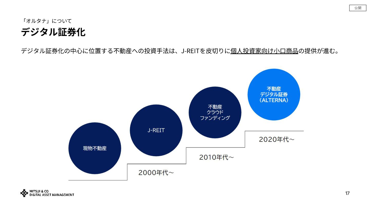 公開 17 デジタル証券化 「オルタナ」について デジタル証券化の中⼼に位置する不動産への投資⼿法は、J-REITを⽪切りに個⼈投資家向け⼩⼝商品の提供が進む。