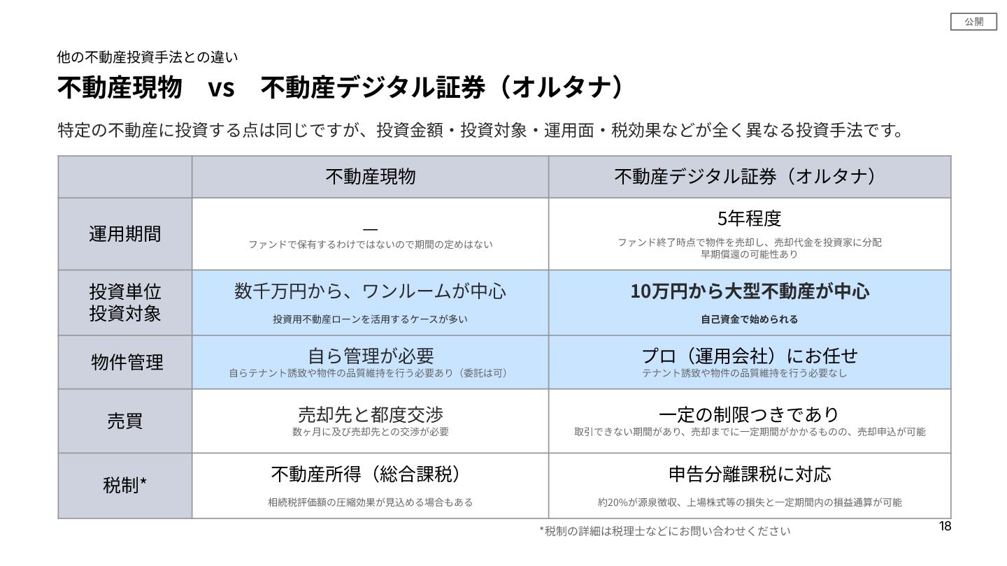 公開 不動産現物 vs 不動産デジタル証券(オルタナ) 他の不動産投資⼿法との違い 特定の不動産に投資する点は同じですが、投資⾦額‧投資対象‧運⽤⾯‧税効果などが全く異なる投資⼿法です。 不動産現物 不動産デジタル証券(オルタナ) 運⽤期間 — ファンドで保有するわけではないので期間の定めはない 5年程度