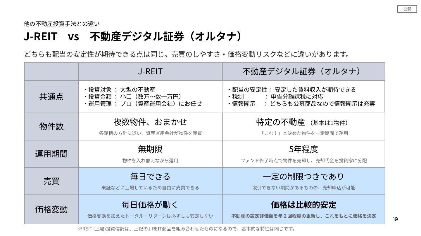 公開 J-REIT vs 不動産デジタル証券(オルタナ) 他の不動産投資⼿法との違い どちらも配当の安定性が期待できる点は同じ。売買のしやすさ‧価格変動リスクなどに違いがあります。 J-REIT 不動産デジタル証券(オルタナ) 共通点 ‧投資対象 : ⼤型の不動産