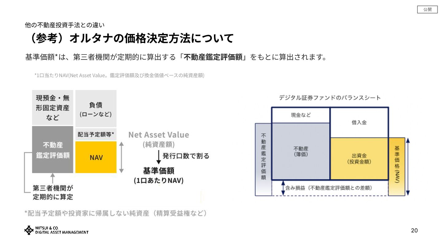 公開 (参考)オルタナの価格決定⽅法について 他の不動産投資⼿法との違い 基準価額*は、第三者機関が定期的に算出する「不動産鑑定評価額」をもとに算出されます。 *1⼝当たりNAV(Net Asset Value。鑑定評価額及び換⾦価値ベースの純資産額) 20