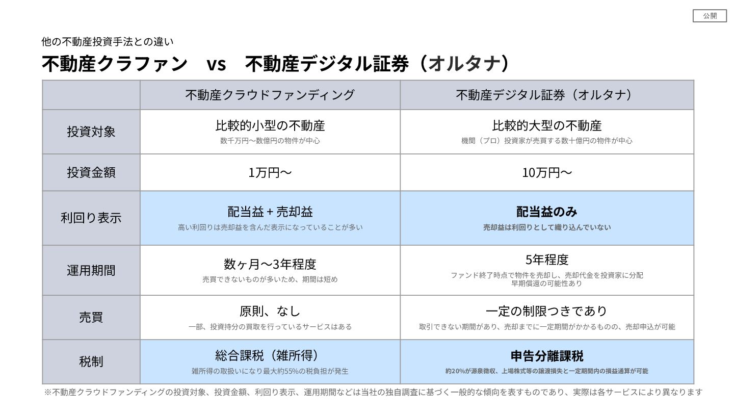 公開 不動産クラファン vs 不動産デジタル証券(オルタナ) 他の不動産投資⼿法との違い 不動産クラウドファンディング 不動産デジタル証券(オルタナ) 投資対象 ⽐較的⼩型の不動産 数千万円〜数億円の物件が中⼼ ⽐較的⼤型の不動産 機関(プロ)投資家が売買する数⼗億円の物件が中⼼
