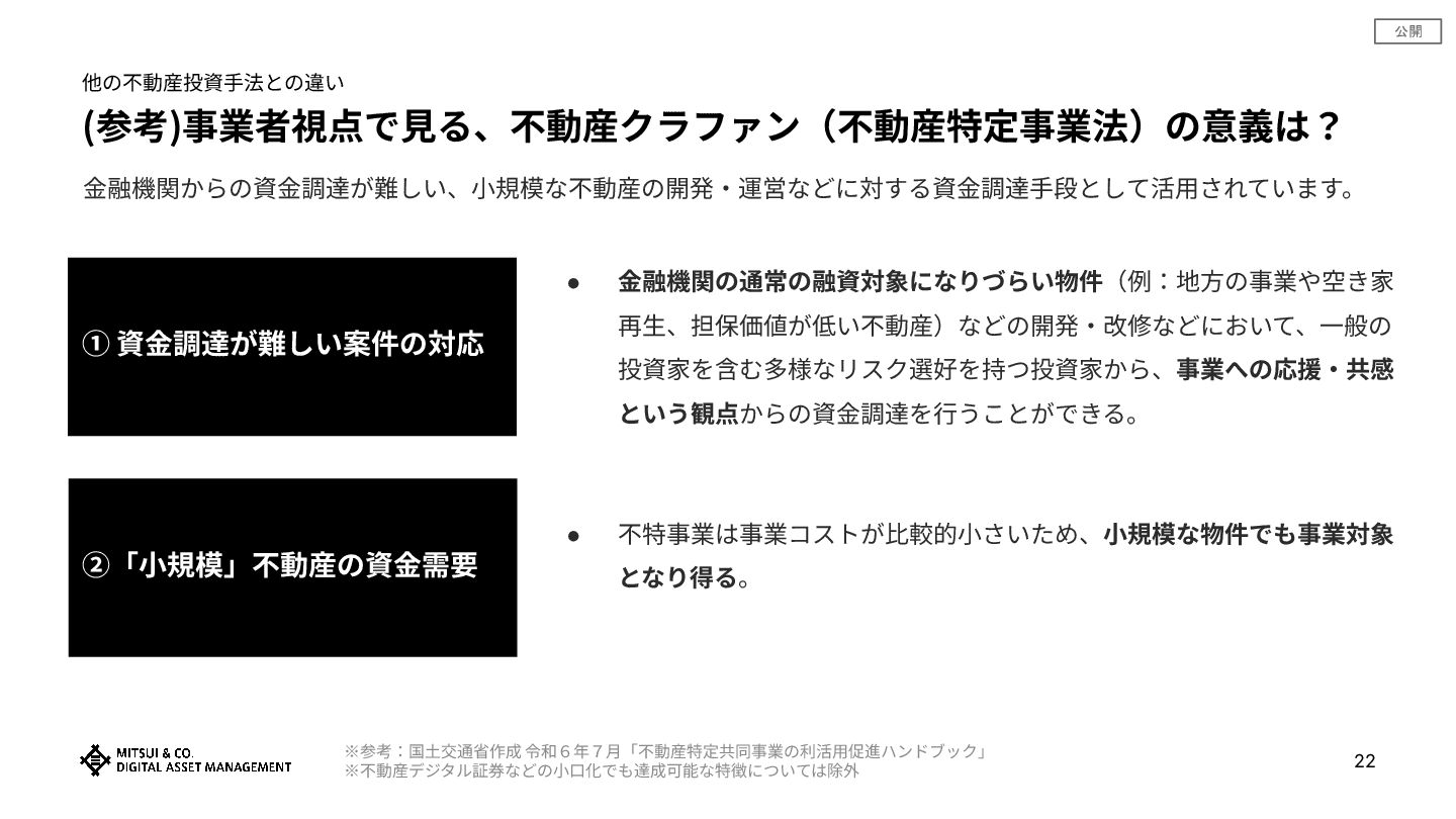 公開 (参考)事業者視点で⾒る、不動産クラファン(不動産特定事業法)の意義は? 他の不動産投資⼿法との違い ※参考:国⼟交通省作成 令和6年7⽉「不動産特定共同事業の利活⽤促進ハンドブック」 ※不動産デジタル証券などの⼩⼝化でも達成可能な特徴については除外 ① 資⾦調達が難しい案件の対応 ②「⼩規模」不動産の資⾦需要 •