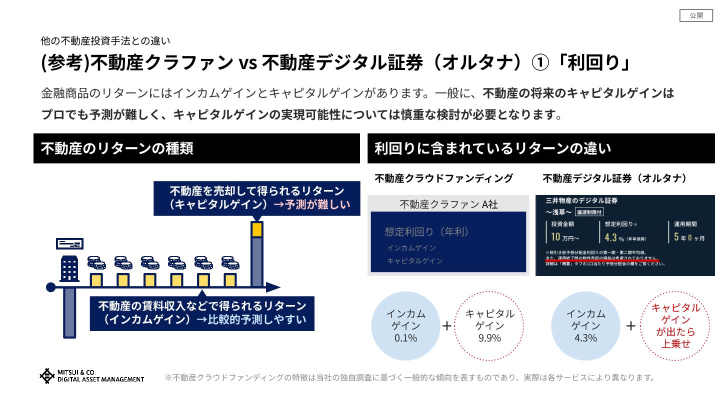 公開 (参考)不動産クラファン vs 不動産デジタル証券(オルタナ)①「利回り」 他の不動産投資⼿法との違い 不動産クラファン A社 想定利回り(年利) インカムゲイン キャピタルゲイン