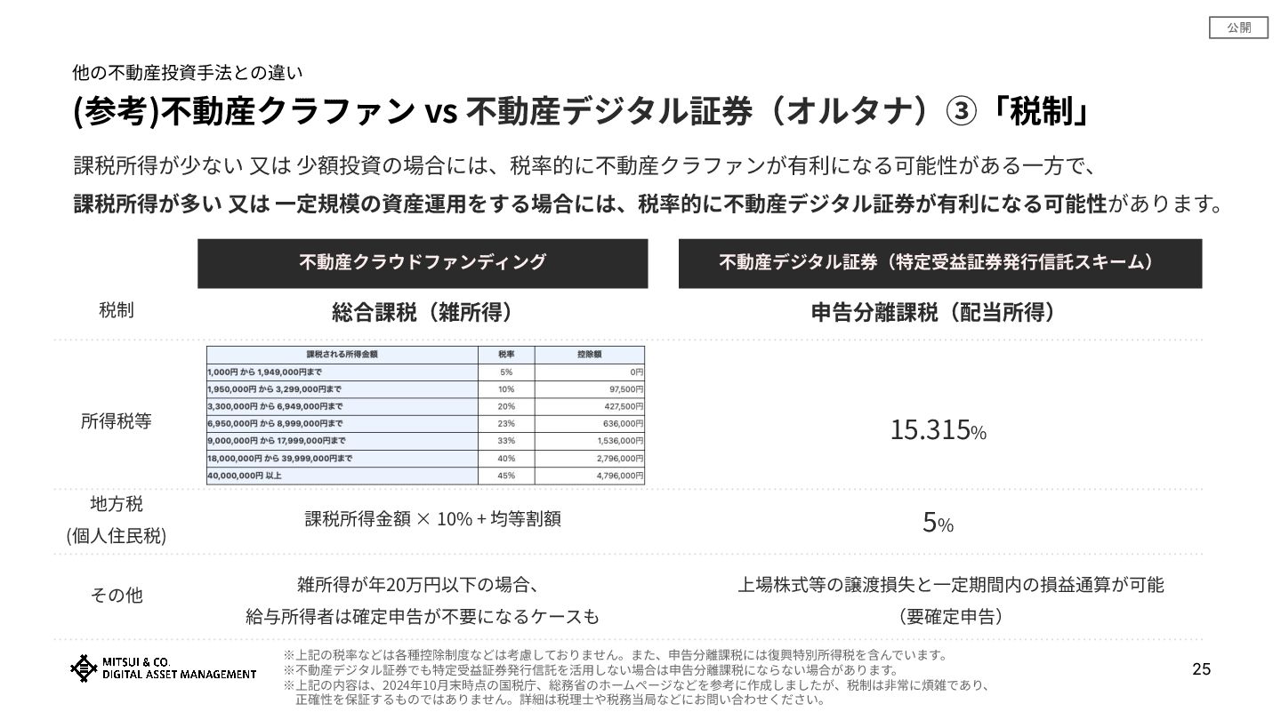 公開 (参考)不動産クラファン vs 不動産デジタル証券(オルタナ)③「税制」 他の不動産投資⼿法との違い 課税所得が少ない ⼜は 少額投資の場合には、税率的に不動産クラファンが有利になる可能性がある⼀⽅で、 課税所得が多い ⼜は