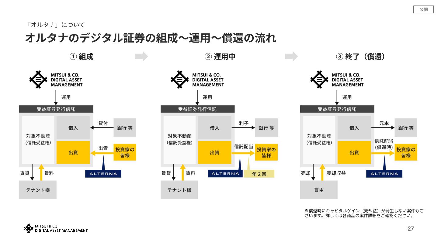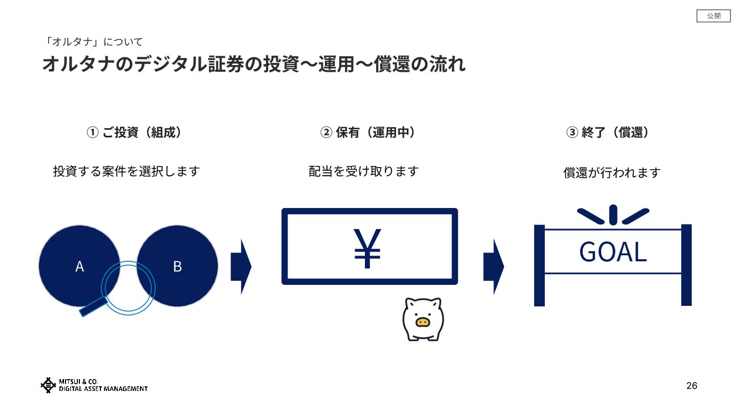 公開 26 「オルタナ」について オルタナのデジタル証券の投資〜運⽤〜償還の流れ ① ご投資(組成) ② 保有(運⽤中) ③ 終了(償還)