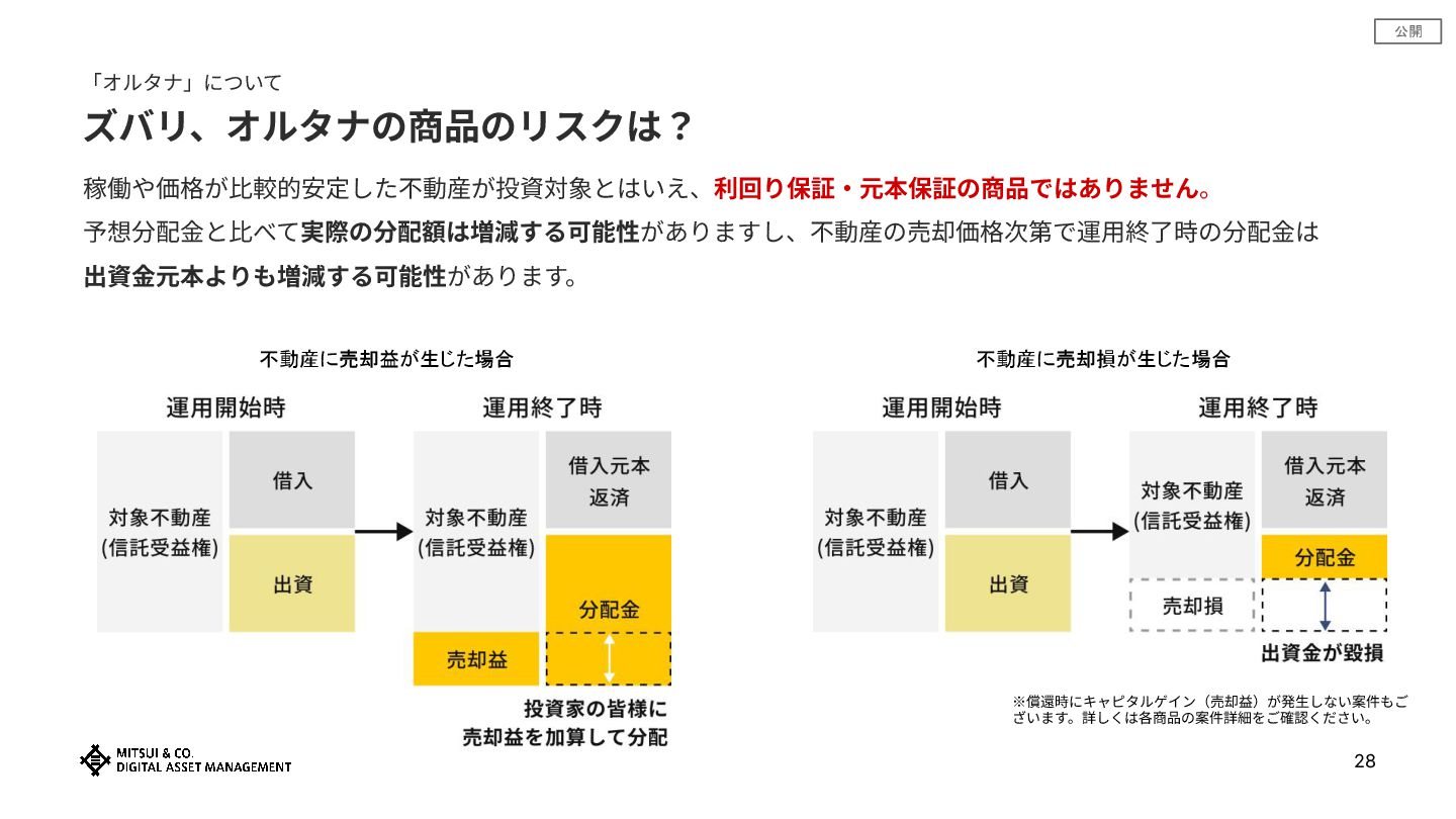 公開 「オルタナ」について 28 ズバリ、オルタナの商品のリスクは? 稼働や価格が⽐較的安定した不動産が投資対象とはいえ、利回り保証‧元本保証の商品ではありません。 予想分配⾦と⽐べて実際の分配額は増減する可能性がありますし、不動産の売却価格次第で運⽤終了時の分配⾦は 出資⾦元本よりも増減する可能性があります。 不動産に売却益が生じた場合 不動産に売却損が生じた場合 ※償還時にキャピタルゲイン(売却益)が発⽣しない案件もご