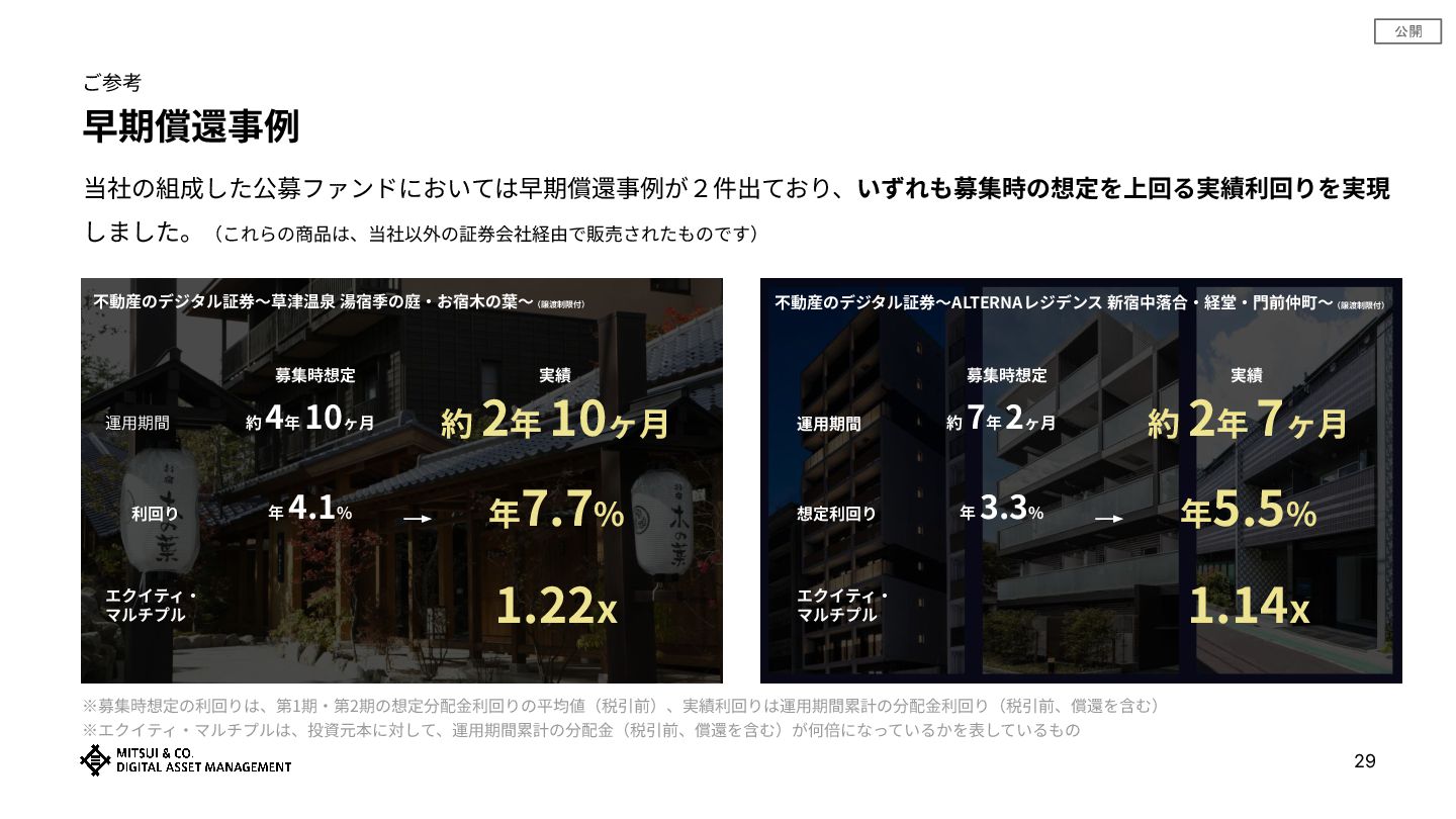 公開 ご参考 早期償還事例 当社の組成した公募ファンドにおいては早期償還事例が2件出ており、いずれも募集時の想定を上回る実績利回りを実現 しました。(これらの商品は、当社以外の証券会社経由で販売されたものです) 不動産のデジタル証券〜草津温泉 湯宿季の庭‧お宿⽊の葉〜(譲渡制限付) 不動産のデジタル証券〜ALTERNAレジデンス 新宿中落合‧経堂‧⾨前仲町〜(譲渡制限付) 運⽤期間