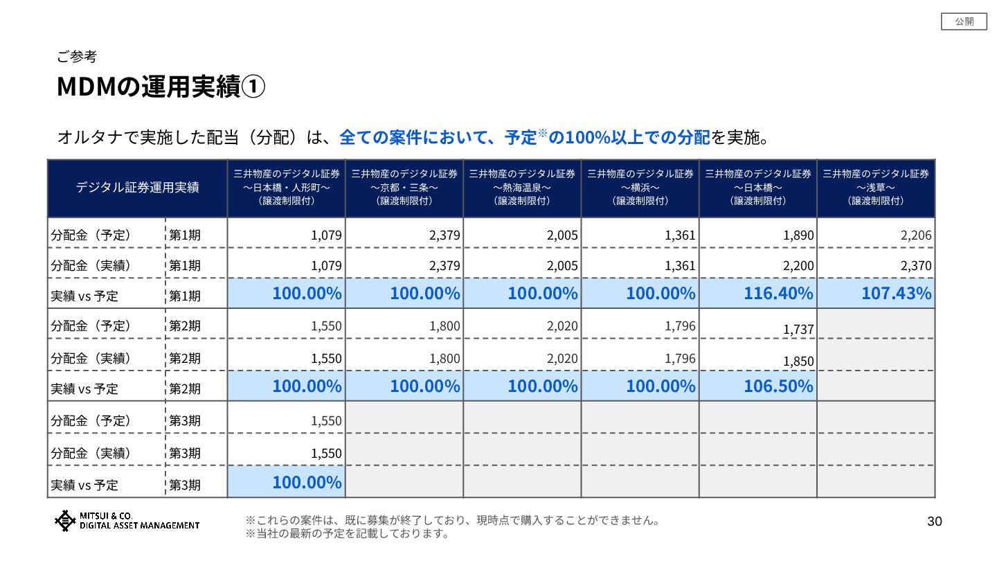 公開 MDMの運⽤実績① ご参考 オルタナで実施した配当(分配)は、全ての案件において、予定※の100%以上での分配を実施。 デジタル証券運⽤実績 三井物産のデジタル証券 〜⽇本橋‧⼈形町〜 (譲渡制限付) 三井物産のデジタル証券 〜京都‧三条〜