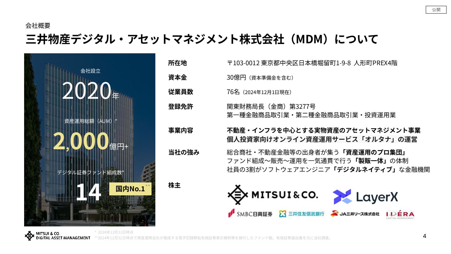 公開 三井物産デジタル‧アセットマネジメント株式会社(MDM)について 会社概要 会社設⽴ 2020年 資産運⽤総額(AUM)* 2, 000億円+ デジタル証券ファンド組成数* 14