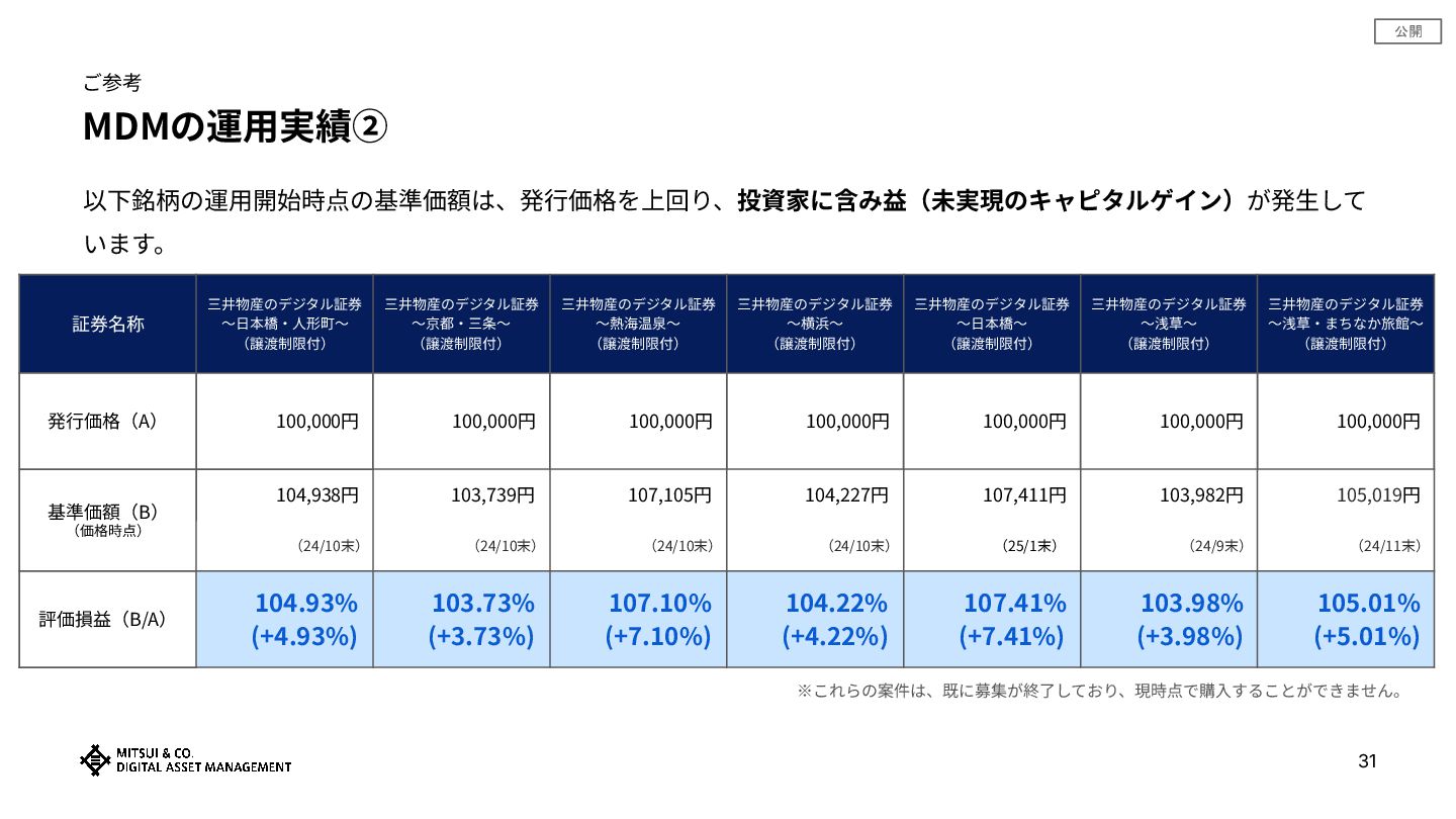 公開 MDMの運⽤実績② 31 ※これらの案件は、既に募集が終了しており、現時点で購⼊することができません。 ご参考 証券名称 三井物産のデジタル証券 〜⽇本橋‧⼈形町〜 (譲渡制限付) 三井物産のデジタル証券