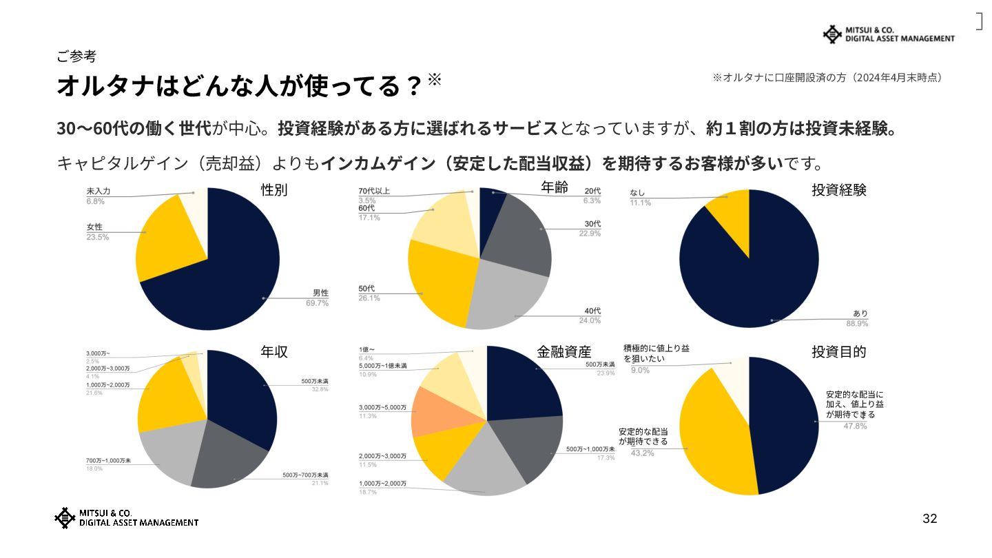 公開 オルタナはどんな⼈が使ってる?※ ご参考 30〜60代の働く世代が中⼼。投資経験がある⽅に選ばれるサービスとなっていますが、約1割の⽅は投資未経験。 キャピタルゲイン(売却益)よりもインカムゲイン(安定した配当収益)を期待するお客様が多いです。 ※オルタナに⼝座開設済の⽅(2024年4⽉末時点) 積極的に値上り益 を狙いたい 安定的な配当に 加え、値上り益