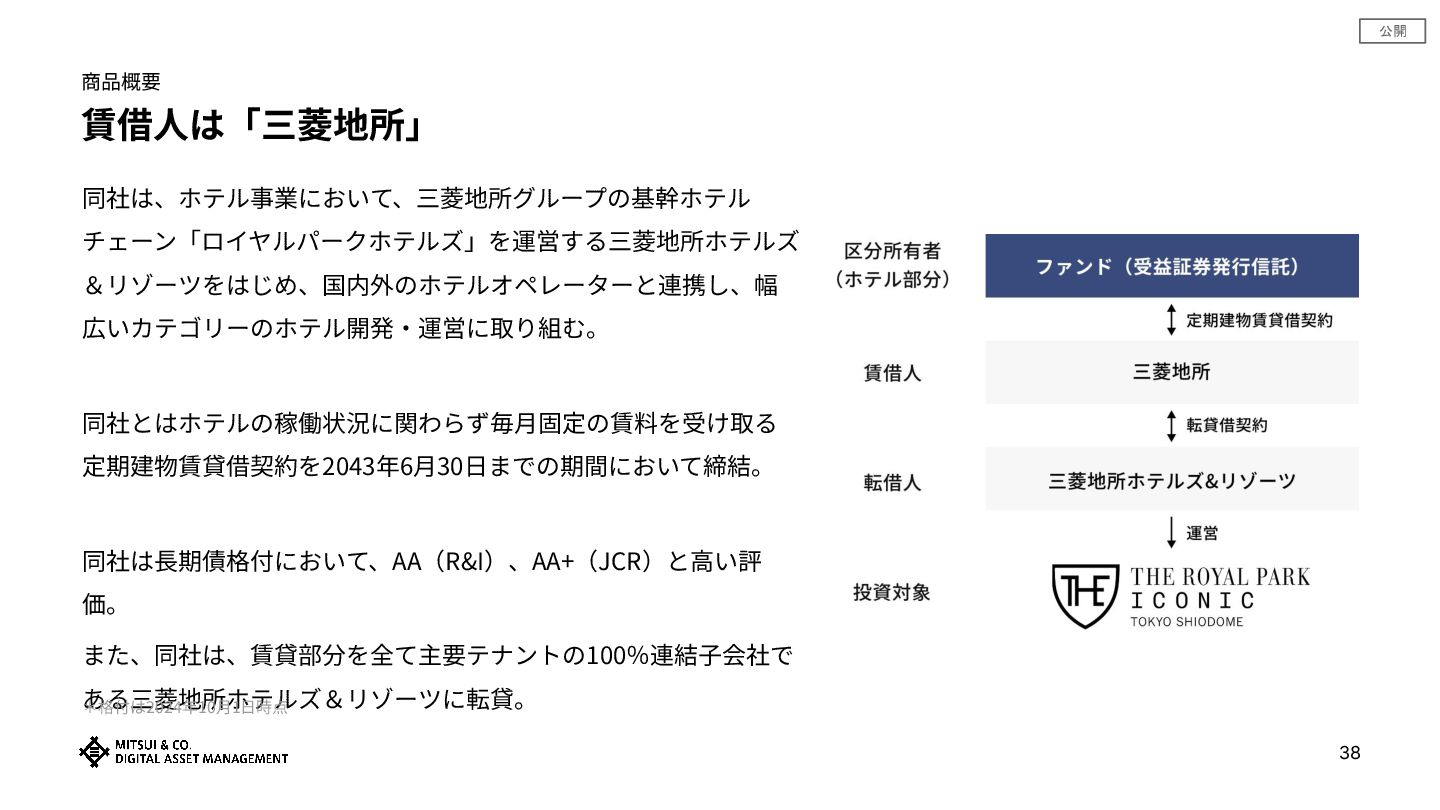 公開 商品概要 賃借⼈は「三菱地所」 同社は、ホテル事業において、三菱地所グループの基幹ホテル チェーン「ロイヤルパークホテルズ」を運営する三菱地所ホテルズ &リゾーツをはじめ、国内外のホテルオペレーターと連携し、幅 広いカテゴリーのホテル開発‧運営に取り組む。 同社とはホテルの稼働状況に関わらず毎⽉固定の賃料を受け取る 定期建物賃貸借契約を2043年6⽉30⽇までの期間において締結。 同社は⻑期債格付において、AA(R&I)、AA+(JCR)と⾼い評