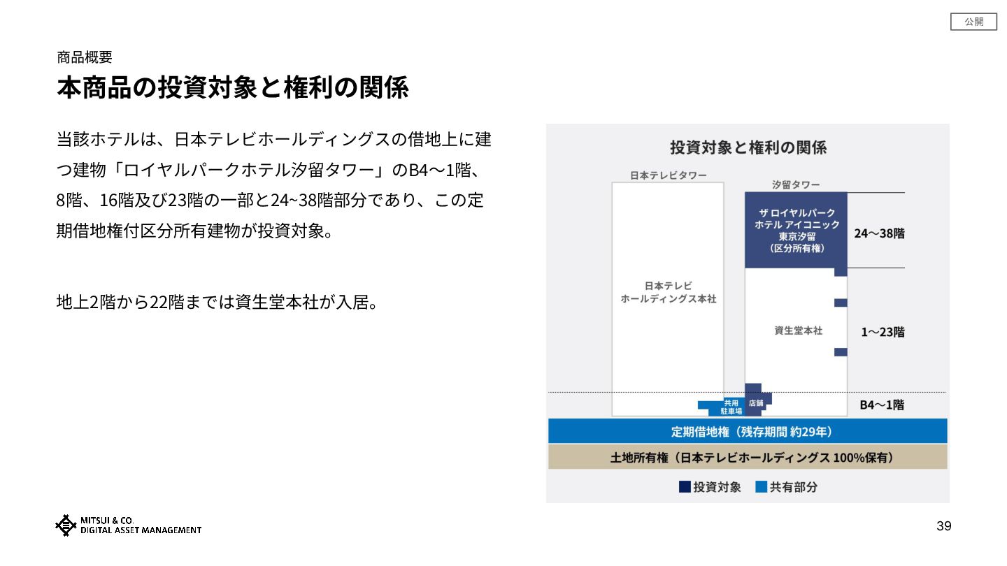 公開 商品概要 本商品の投資対象と権利の関係 39 当該ホテルは、⽇本テレビホールディングスの借地上に建 つ建物「ロイヤルパークホテル汐留タワー」のB4〜1階、 8階、16階及び23階の⼀部と24~38階部分であり、この定 期借地権付区分所有建物が投資対象。 地上2階から22階までは資⽣堂本社が⼊居。