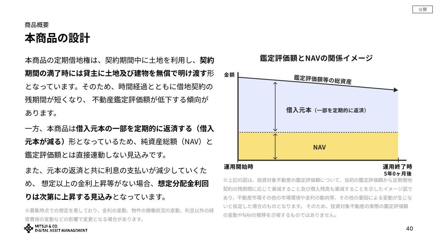 元本が減る)形となっているため、純資産総額(NAV)と 鑑定評価額とは直接連動しない⾒込みです。 また、元本の返済と共に利息の⽀払いが減少していくた め、 想定以上の⾦利上昇等がない場合、想定分配⾦利回 りは次第に上昇する⾒込みとなっています。 40 ※上記の図は、投資対象不動産の鑑定評価額について、当初の鑑定評価額から定期借地 契約の残期間に応じて漸減すること及び借⼊残⾼も漸減することを⽰したイメージ図で あり、不動産市場その他の市場環境や⾦利の動向等、その他の要因による変動が⽣じな いと仮定した場合のものとなります。 そのため、投資対象不動産の実際の鑑定評価額 の変動やNAVの推移を⽰唆するものではありません。 ※募集時点での想定を表しており、⾦利の変動、物件の稼働状況の変動、利息以外の経 常費⽤の変動などの影響で変更となる場合があります。