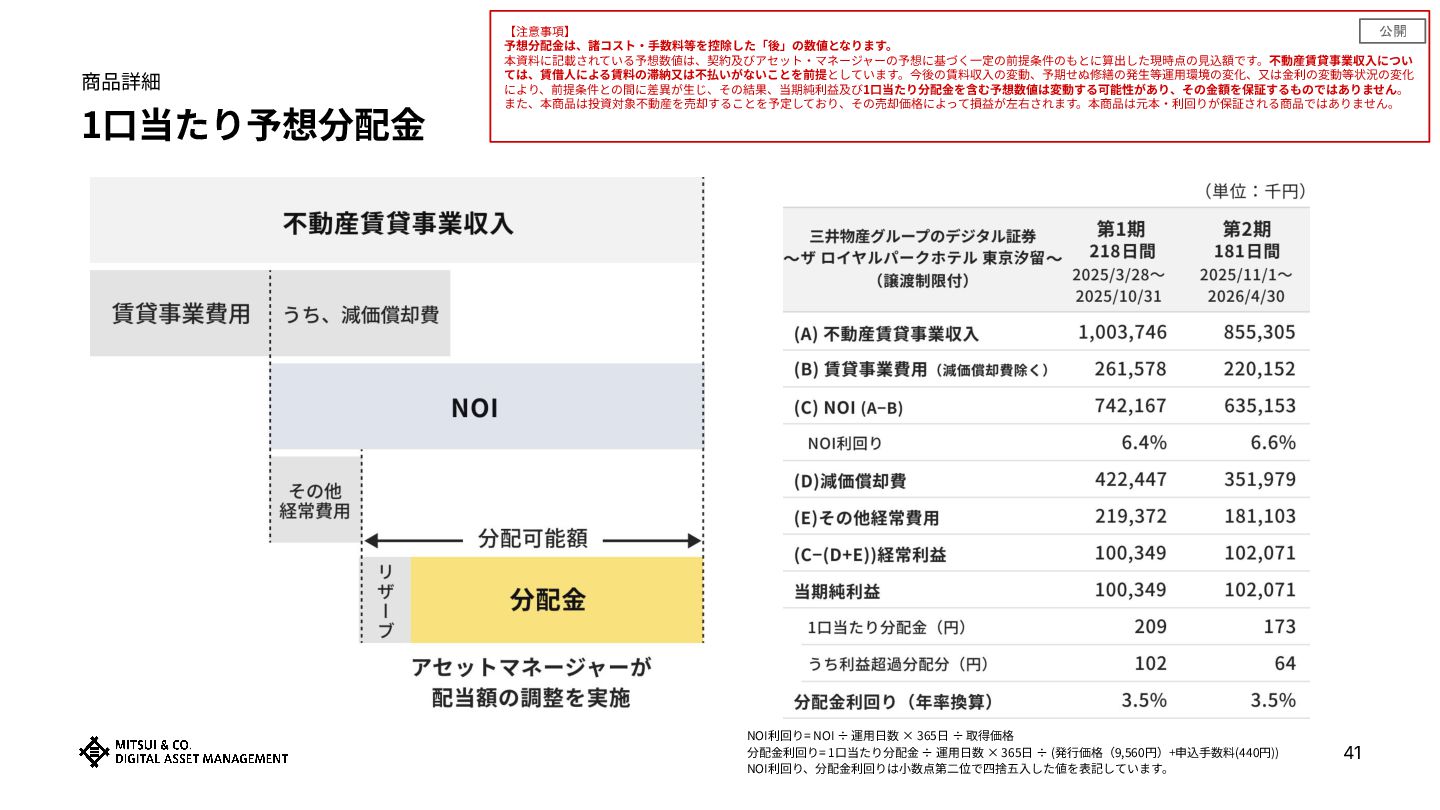 取得価格 分配⾦利回り= 1⼝当たり分配⾦ ÷ 運⽤⽇数 × 365⽇ ÷ (発⾏価格(9,560円)+申込⼿数料(440円)) NOI利回り、分配⾦利回りは⼩数点第⼆位で四捨五⼊した値を表記しています。 41 【注意事項】 予想分配⾦は、諸コスト‧⼿数料等を控除した「後」の数値となります。 本資料に記載されている予想数値は、契約及びアセット‧マネージャーの予想に基づく⼀定の前提条件のもとに算出した現時点の⾒込額です。不動産賃貸事業収⼊につい ては、賃借⼈による賃料の滞納⼜は不払いがないことを前提としています。今後の賃料収⼊の変動、予期せぬ修繕の発⽣等運⽤環境の変化、⼜は⾦利の変動等状況の変化 により、前提条件との間に差異が⽣じ、その結果、当期純利益及び1⼝当たり分配⾦を含む予想数値は変動する可能性があり、その⾦額を保証するものではありません。 また、本商品は投資対象不動産を売却することを予定しており、その売却価格によって損益が左右されます。本商品は元本‧利回りが保証される商品ではありません。