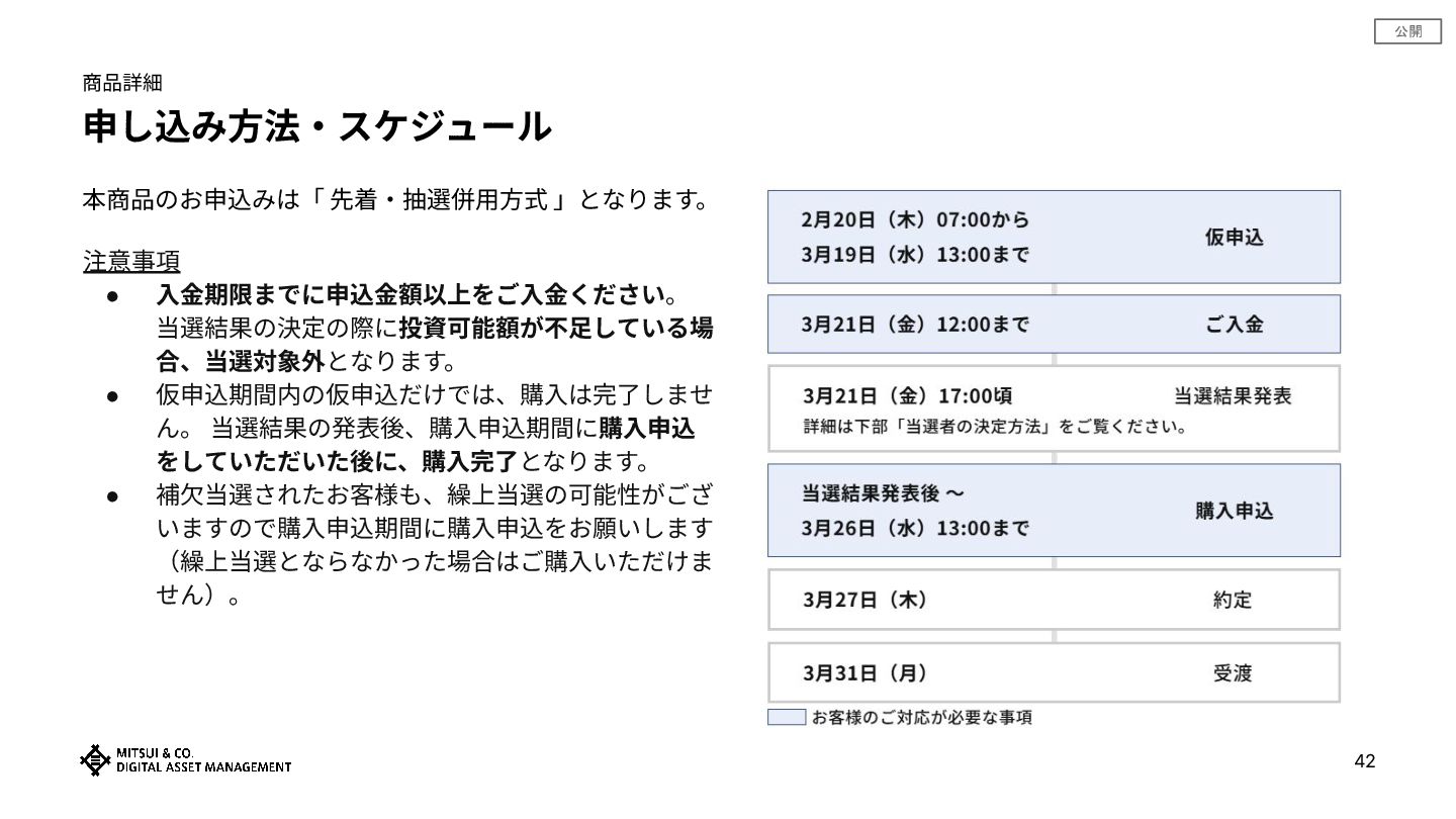 公開 申し込み⽅法‧スケジュール 注意事項 • ⼊⾦期限までに申込⾦額以上をご⼊⾦ください。 当選結果の決定の際に投資可能額が不⾜している場 合、当選対象外となります。 • 仮申込期間内の仮申込だけでは、購⼊は完了しませ ん。