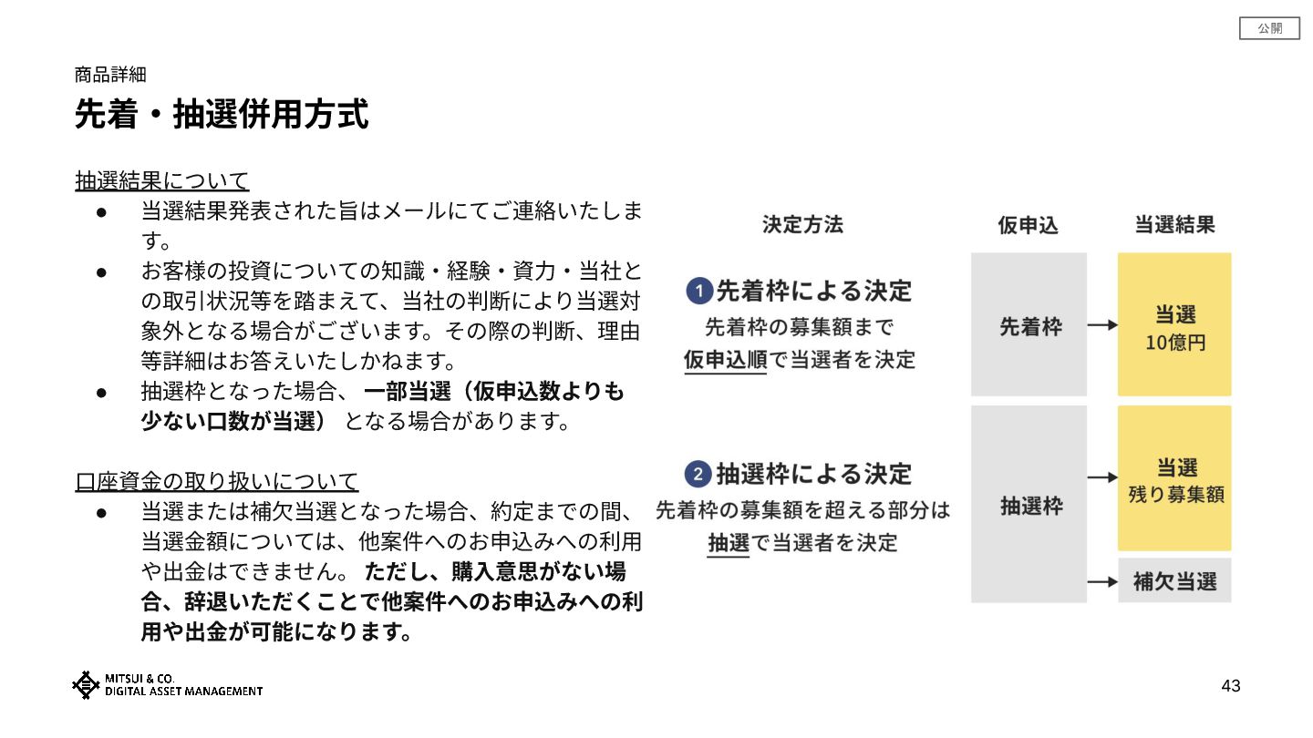 公開 先着‧抽選併⽤⽅式 抽選結果について • 当選結果発表された旨はメールにてご連絡いたしま す。 • お客様の投資についての知識‧経験‧資⼒‧当社と の取引状況等を踏まえて、当社の判断により当選対 象外となる場合がございます。その際の判断、理由